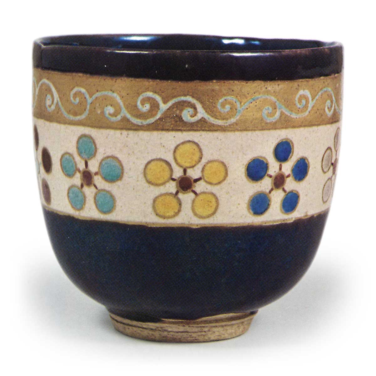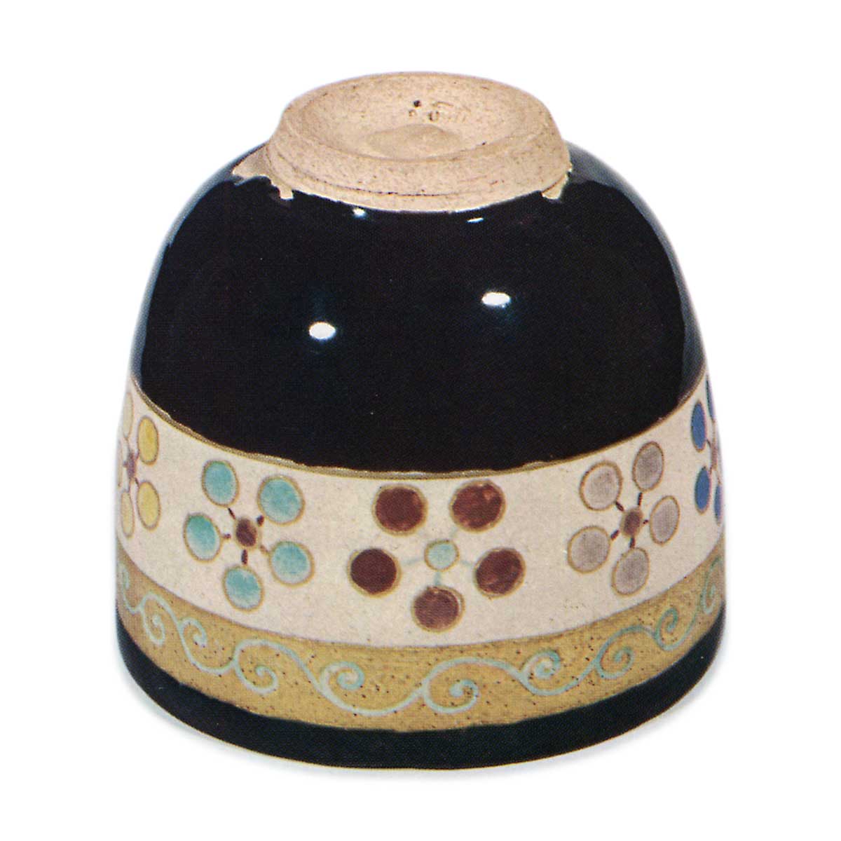 仁清色绘梅鉢纹茶碗 仁清仁清色绘梅鉢纹茶碗 2025.10.19 仁清色绘梅鉢纹茶碗 仁清色绘梅鉢纹茶碗 高10.0厘米 口径10.5×10.7厘米 底径4.5厘米碗身呈圆润挺拔的筒形,整体略显厚实。口部微呈椭圆形,底足内侧刻痕浅而圆润,其侧面捺有仁清印章。碗身施以与「色绘金银菱纹重茶碗」(图22)同款的长石质白釉,自口沿至内壁及碗底边缘覆以黑釉。碗身以浅青、青、淡紫、赤等色绘制梅鉢纹,其上部则以金泥为底,饰以浅青唐草纹带状纹样。此茶碗为加贺前田家传世之物,其匣盖正面题有“仁清烧 茶碗 梅八白烧”字样,堪称匣具精良之作。