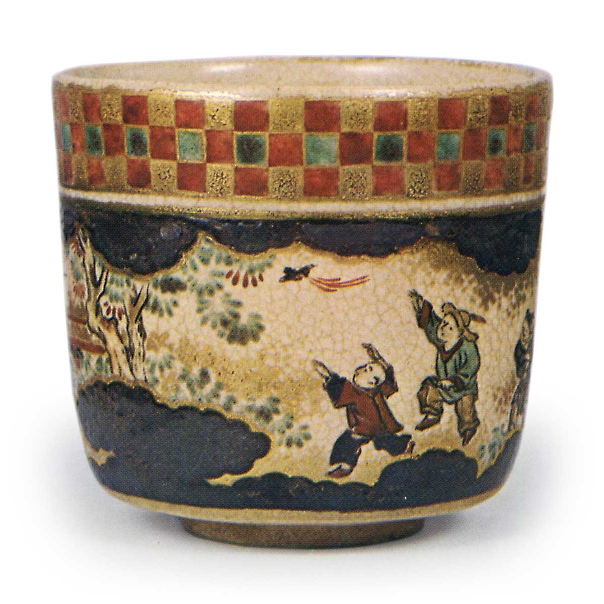 仁清色绘唐子游图茶碗 仁清仁清色绘唐子游图茶碗 2025.10.19 仁清色绘唐子游图茶碗 仁清色绘唐子游图茶碗 高8.1厘米 口径8.4厘米 高台径4.1厘米碗身呈筒形,自口部向下略微外翻,整体尺寸小巧。除腰部至高台周围外,内外侧正面厚施略带粗粝的釉料,外侧口沿饰以红、金、绿三色市松纹样,碗身绘有唐童嬉戏图。碗口上下方的源氏云纹因曾施银彩,现已氧化发黑。此作在仁清茶碗中实属罕见。高台内左侧捺有仁清的“宗和”印章。