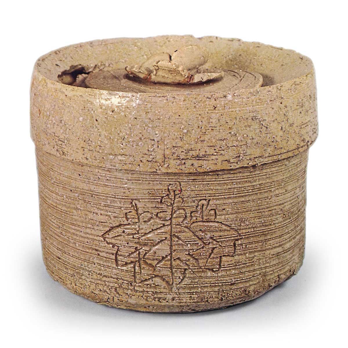 本阿弥光悦之孙空中斋光甫效法祖父光悦烧制乐烧茶碗,此外还留存着被称为“空中信乐”的信乐风格水指、香合、茶碗等器物,在茶道爱好者间声誉卓著。此水指乃空中制作水指中自古最负盛名之作,其造型仿效志野、备前乃至信乐等地的矢筈口水指,然空中自有其审美偏好,将其塑造成翩然洒脱之作。肩部锐利地勾勒棱线,器身分段处理,下半部饰以丝目风格的梳纹,器身两侧以钉刻技法呈现桐花纹样,腰部浅收,底面平整。共盖的系绳上饰有五瓣花纹,制作手法颇具雅致韵味,盖绳侧面以针描技法细刻空中文字。陶土中混入长石颗粒,除底面与部分内壁外,整体施以薄灰釉,内壁则流淌着如仁清陶般的青釉。口部出现大面积窑裂,经金修补缮。