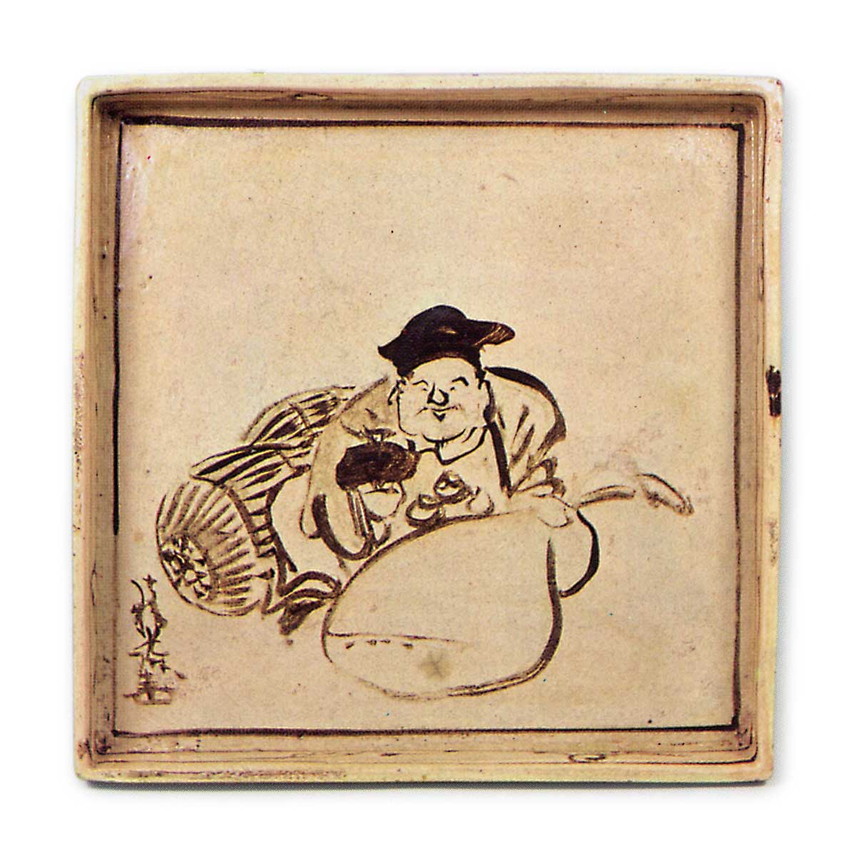 乾山锈绘大黑图角皿 乾山乾山锈绘大黑图角皿 2025.10.20 乾山锈绘大黑图角皿 高2.9厘米 口径22.0×22.0厘米藤田美术馆此为藤田美术馆藏十枚大黑图角皿之一,盘面题有“法桥光琳画”款,背面镌刻“乾山”铭。此类器皿古称“盖形”,曾见箱盖内侧题写“乾山砚盖”之例。