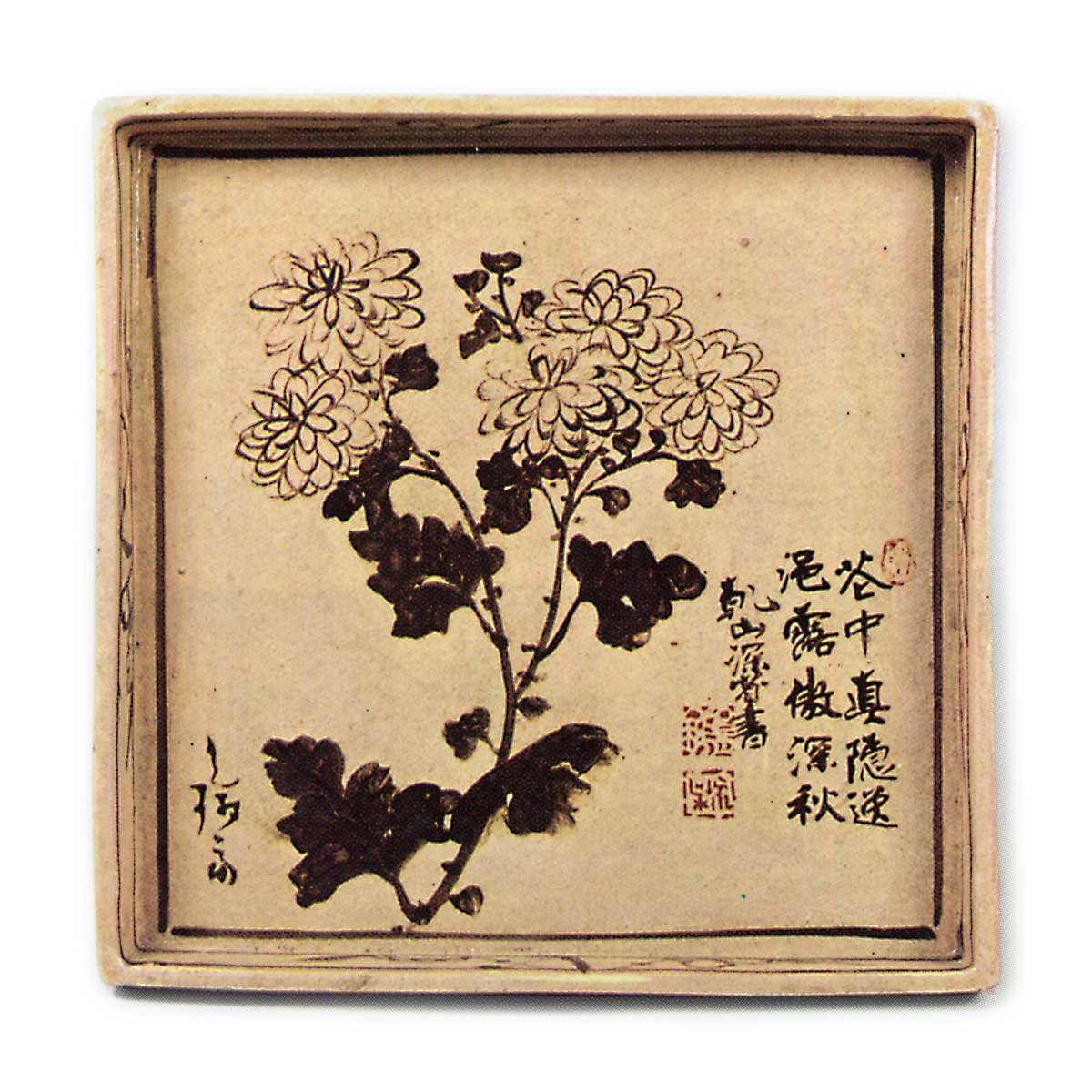 乾山锈绘菊图角皿 乾山乾山锈绘菊图角皿 2025.10.20 乾山锈绘菊图角皿 高3.0厘米 口径22.2×22.2厘米藤田美术馆此为藤田美术馆所藏十枚角皿之一。盘面以光琳独具特色的笔触描绘折枝菊纹,尤以菊叶处最能体现其精髓。盘底钤有“光琳斎”款,右下角附有乾山题诗文:“花中真隐逸 露傲深秋 乾山深省书”。