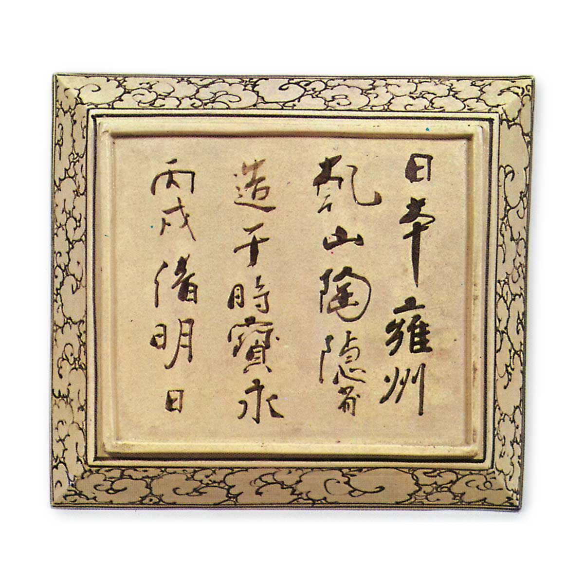 乾山銹絵山水図額皿 乾山乾山銹絵山水図額皿 X Facebook Hatena Bookmark LINE Pinterest 复制 2025.10.20 乾山銹絵山水図額皿 乾山銹絵山水図額皿 高4.4厘米 口径25.6×28.1厘米此为侧面斜立的端庄矩形框盘,盘面以雪舟风格笔触细腻描绘山水人物图,侧面四窗饰唐草纹牡丹,周缘绘波纹。笔触略显硬朗,素地烧成效果亦与其他角盘迥异。背面题记“日本雍州乾山陶隐省造于时宝永丙戌偖明日”的笔体虽与图118、图152略有差异,却与图154中“家兄法桥云云”的字体相近,或许是刻意模仿定家风格所致。“雍州”与“乾山”二字已显露乾山特有的笔锋。然而盘面绘制的图案究竟是否出自乾山之手尚难定论,但背面所载“宝永丙戌”年款确属宝永三年。