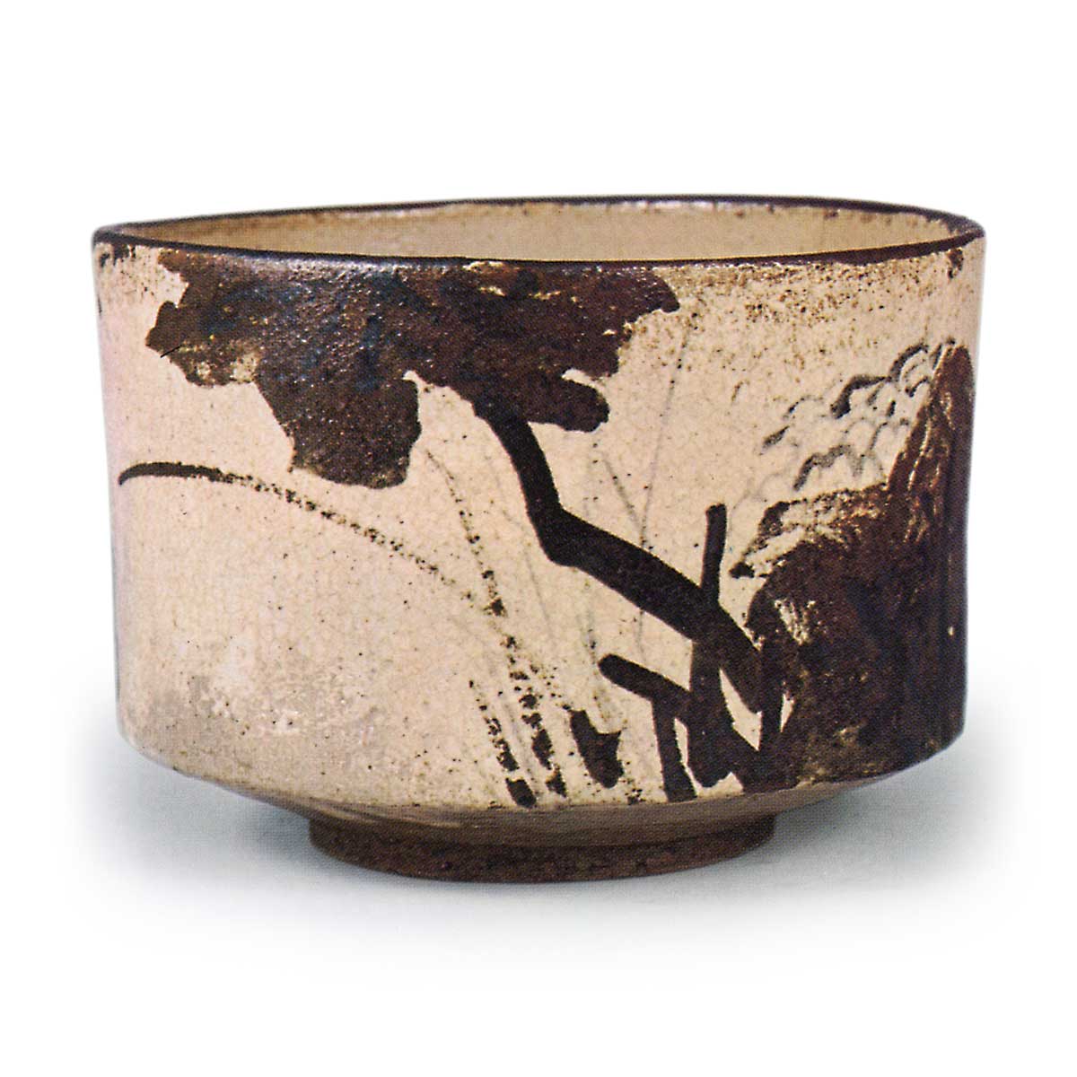 乾山锈彩染付芙蓉图茶碗 乾山乾山锈彩染付芙蓉图茶碗 2025.10.20 乾山锈彩染付芙蓉图茶碗 高7.3厘米 口径9.9~10.6厘米 高台径5.5厘米此为半筒形茶碗,碗身一侧以铁彩与钴蓝绘制芙蓉与芒草图样,另一侧题有诗文”花开独占(秋) 乾山省昼 (题) (花押)」题诗文。此类锈彩染付茶碗中,此作绘饰尤显雅致。碗口边缘及高台至腰部出现斑痕。