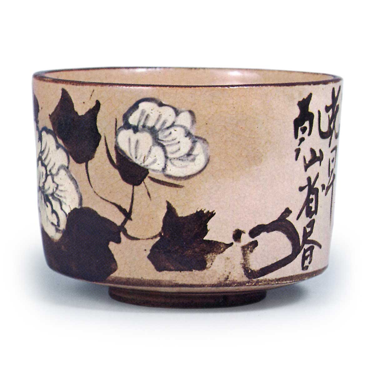 乾山釉下彩芙蓉图茶碗 乾山乾山釉下彩芙蓉图茶碗 2025.10.20 乾山釉下彩芙蓉图茶碗 高7.1厘米 口径9.9厘米 高台径4.9厘米芙蓉图案以钴蓝与铁青颜料绘制,芙蓉叶则仿效光琳风格。碗身一侧题有诗赞「繁华木占春光早 乾山省昼 (书)(花押)」,高台与腰部之间环绕着一道铁青颜料线条。