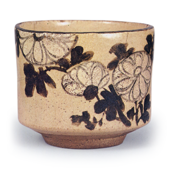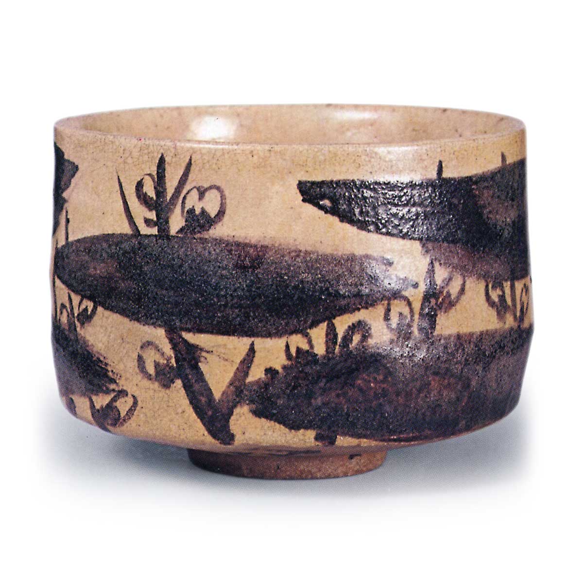 此类乾山茶碗中颇具独特韵味,碗形呈裾张式,碗身留有凹痕,高台紧凑,尽显茶碗应有的匠心。碗身以粗犷笔触描绘出意象化的霞纹,其间环绕着带蓓蕾的枪梅纹样,尽显乾山特有的设计风格。高台侧面刻有小巧的「乾山」铭记。