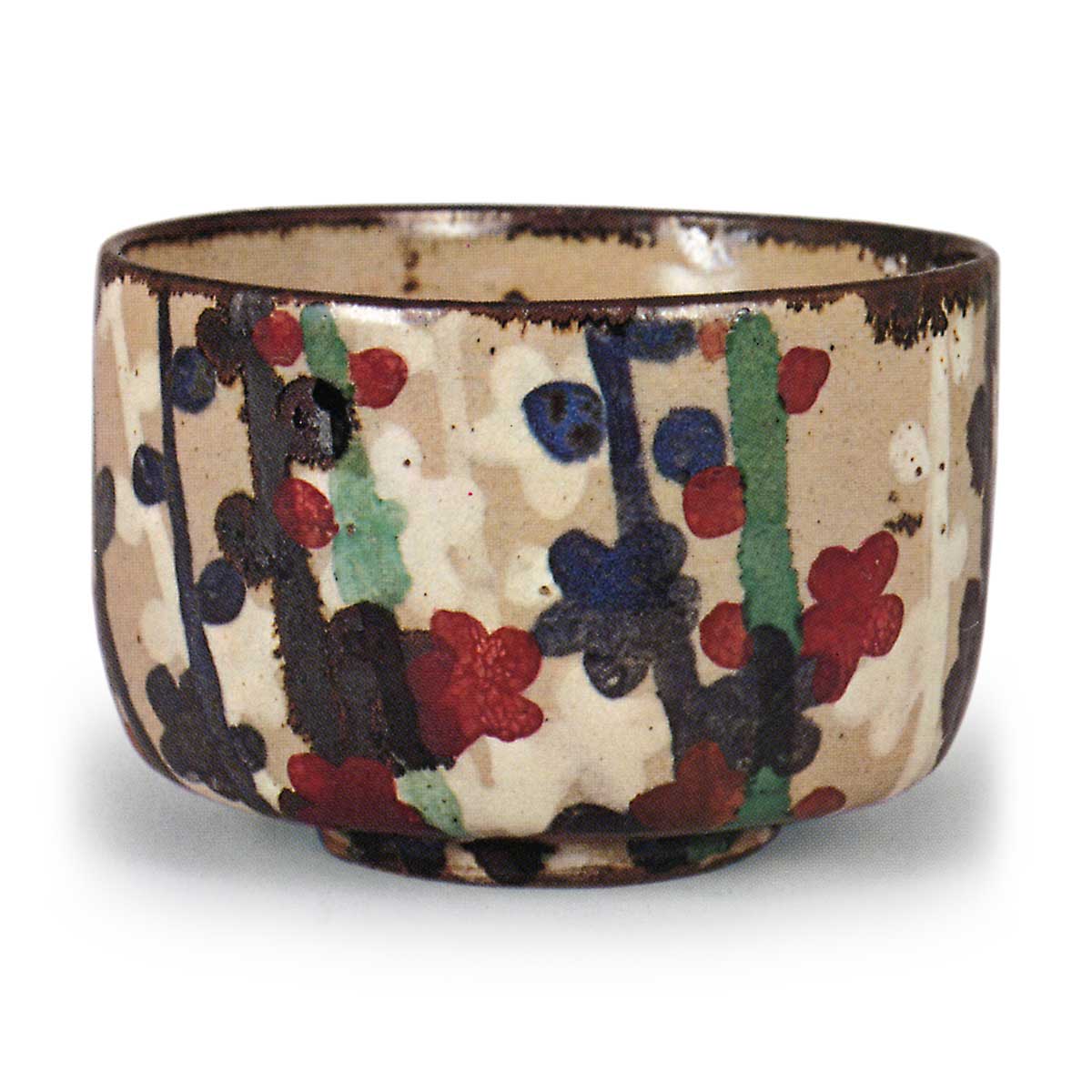乾山色绘梅纹茶碗 乾山乾山色绘梅纹茶碗 X Facebook Hatena Bookmark LINE Pinterest 复制 2025.10.20 乾山色绘梅纹茶碗 高7.0厘米 口径10.0~10.5厘米 高台径5.1厘米此茶碗较梅纹茶碗烧制更为坚实。釉下以铁绘颜料、钴蓝及白泥描绘梅枝、花苞或花朵,施透明釉后,于釉面绘制红色花朵与绿色枝条。此类茶碗均在碗口边缘刷涂铁绘颜料,形成口红般的色泽,这已成为固定技法。未题诗赞的器物多在高台侧面或内壁题写“乾山”铭文,而此碗则在裸露陶土的高台内壁以铁绘颜料题写“乾山”。此碗原属大阪鸿池家传世之物。