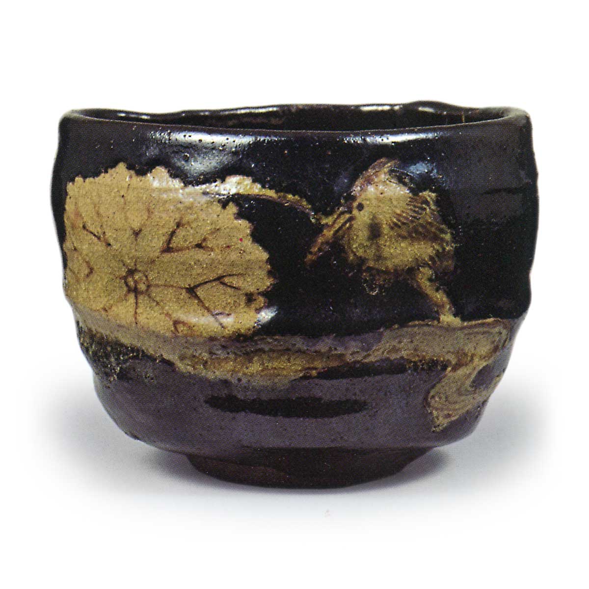 乾山莲翡翠图黑茶碗 乾山乾山莲翡翠图黑茶碗 2025.10.20 乾山莲翡翠图黑茶碗 高7.8厘米 口径10.2厘米 高台径4.7厘米此为轆轤拉坯制成的稍厚茶碗,非乐烧而是本烧黑茶碗。黑釉底上以锈彩与黄釉描绘莲花流水与翡翠纹样。虽无其他同类例证,但根据胎足内露土处书写的“乾山”铭文字体推断应为乾山作品。该铭文先以铁绘颜料书写,再覆以黄釉压印。胎土成分与陶器器皿相同,均属含铁量较高的质地。
