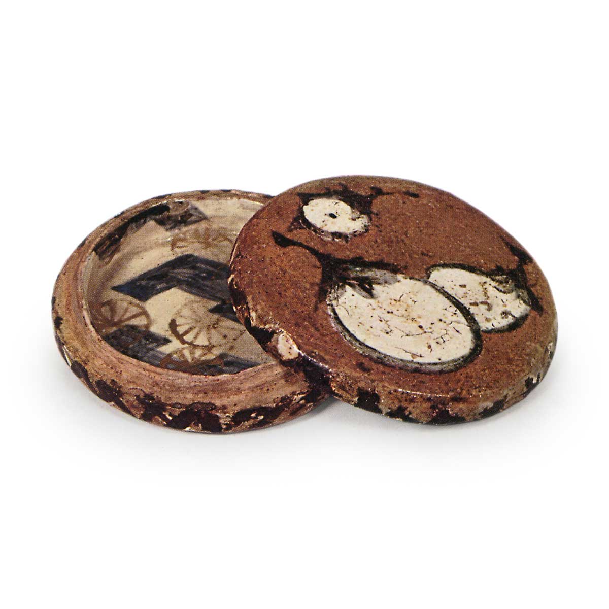 乾山锈绘染付茄子纹香盒 乾山乾山锈绘染付茄子纹香盒 X Facebook Hatena Bookmark LINE Pinterest 复制 2025.10.20 乾山锈绘染付茄子纹香盒 高2.2厘米 口径6.8厘米 底径8.2厘米此为圆形平底香盒,其上亦饰有乾山特有的白釉彩绘纹样。具体而言:盖面素坯上以白泥与锈彩绘制茄子纹样,施透明釉;侧面以铁彩描绘桧垣风纹饰;内壁与盖底则以白釉地为底,先用钴蓝底彩勾勒八桥与菊花纹样,再施金彩上彩。底面题有「乾山」铭文及花押。内盒盖内侧题有「中井主水正所赠 宝永二年乙酉三月日」字样。宝永二年正值乾山居于鸣泷时期,故此器亦可推断为鸣泷时期作品。