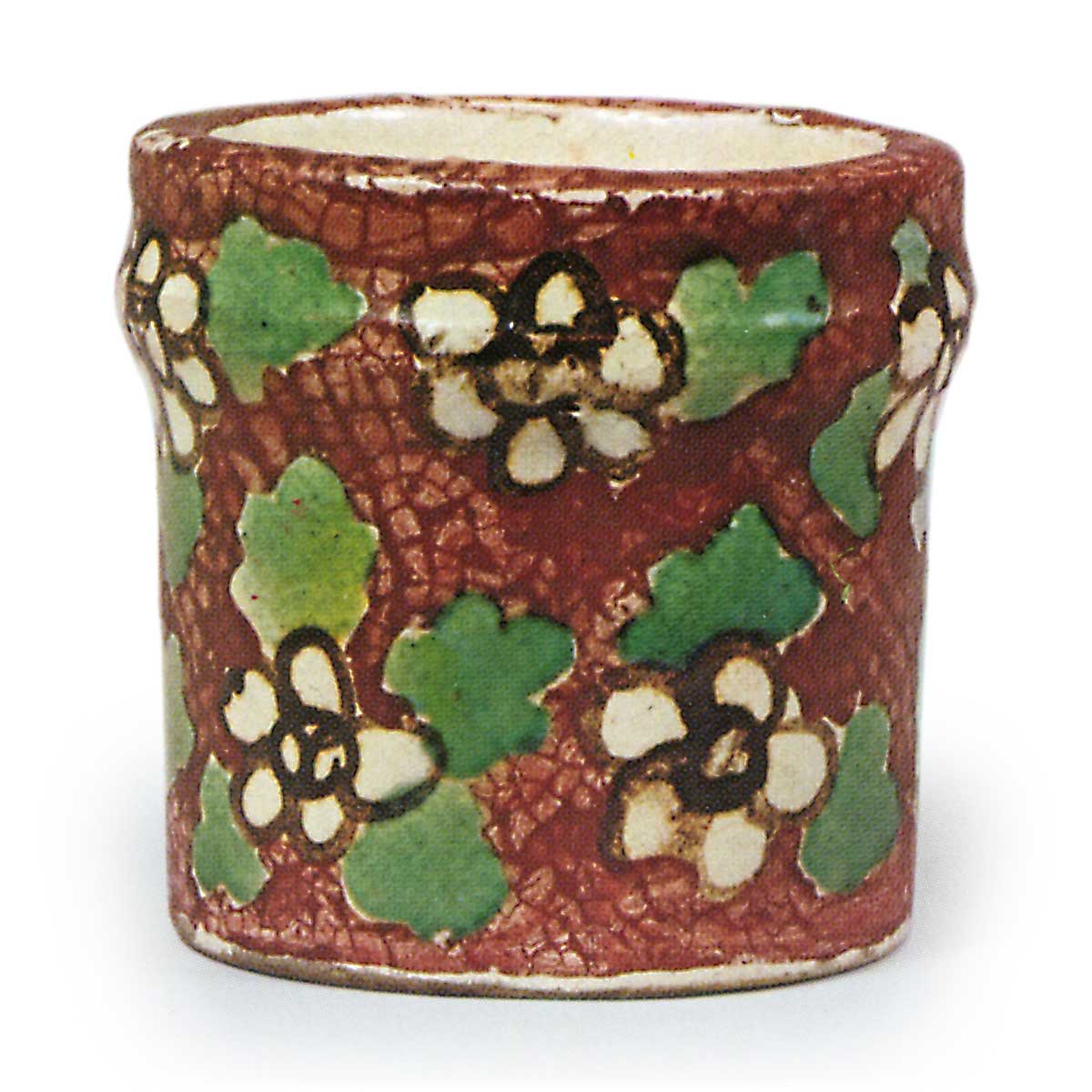 乾山色绘花纹盖置 乾山乾山色绘花纹盖置 2025.10.20 乾山色绘花纹盖置 高5.1厘米 口径5.1厘米 底径4.6厘米畠山纪念馆此作仿照竹制盖置造型,同样施以全面白釉,于器身各处以锈色颜料点缀六瓣小花,烧制后覆盖透明釉,叶片饰以绿色,底面则涂满红色。此为乾山盖置中最具韵味之作,内侧裙边以白釉地衬铁彩题写“乾山”铭文,内壁同样施透明釉。仅榻榻米状台座处露出素坯。