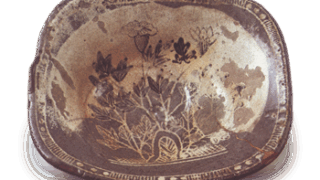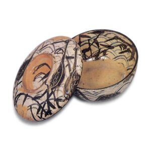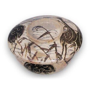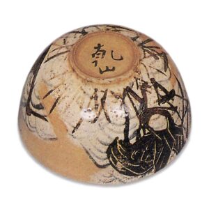 此为椀形器身配以略显扁平的大盖,属平凡器型的成套盖碗。鉴于乾山烧存世同款器物众多,推测乾山应是批量采购此类素坯,施以独特彩绘后上市销售。如今这类盖碗多已不作日常器皿使用,通常拆盖后作为抹茶碗使用。而此套器物完整保留了十只碗盖成对的原始形态,且碗身与盖内外的芦鹤纹饰尤为精美。技法与筒向小碗、锈绘染付绘替向小碗相同:先局部施白釉底,再以钴蓝绘制波纹,继而用铁绘颜料粗略描绘鹤形,于鹤羽及轮廓局部添针描细笔,最后在除高台内侧外的全器身施透明釉进行本烧。白釉底的布局别具匠心,鹤的姿态丰富多变,每只杯碟的绘制皆自由变化,绝非匠人式的机械描绘,处处透着风雅雅致的设计意趣。胎足内侧均题有“乾山”三字,字体不尽相同。虽无配套原箱,但存有制作初期的原始箱,箱盖表面题有“正德三年”(1713)年款,据此推测应是迁居二条丁子屋町后的正德二年(1712)不久所作。