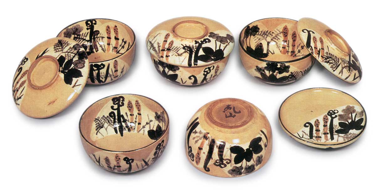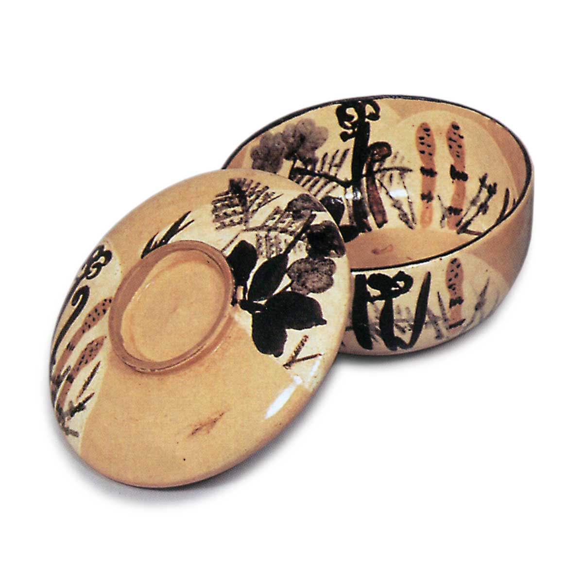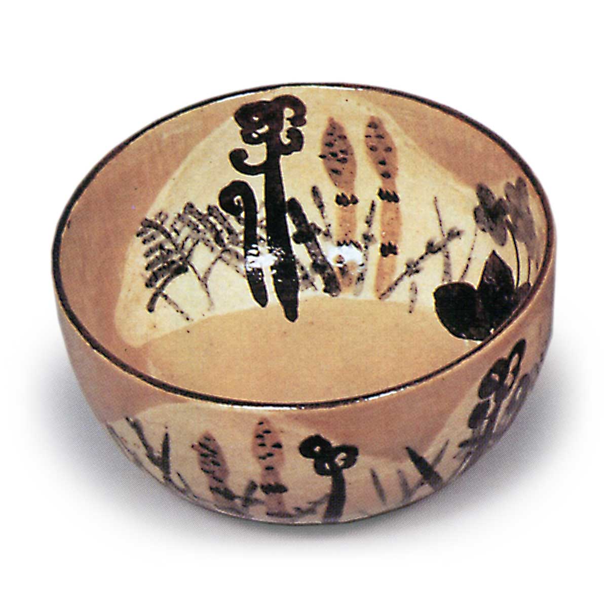 乾山锈绘染付春草纹盖碗 乾山乾山锈绘染付春草纹盖碗 2025.10.20 乾山锈绘染付春草纹盖碗 乾山锈绘染付春草纹盖碗 高8.1厘米 口径11.5厘米 高台径5.2厘米汤木美术馆与「锈绘染付芦鹤纹盖碗」并称乾山盖碗杰作。此作以看似寻常的购入盖碗为胎体,于盖面、盖底及碗身内外施以如土坡般的白釉,其上悠然描绘毛茛、蕨类、堇菜等春草纹样,仅留高台边缘施透明釉。十只茶碗完美成套,每只高台内侧均题有“乾山”铭文。字体虽相近却不尽相同,尽显随性之笔。茶碗收纳于精美共箱,箱面盖面以粗笔题写“盖茶碗 画春草 十 乾山制”。