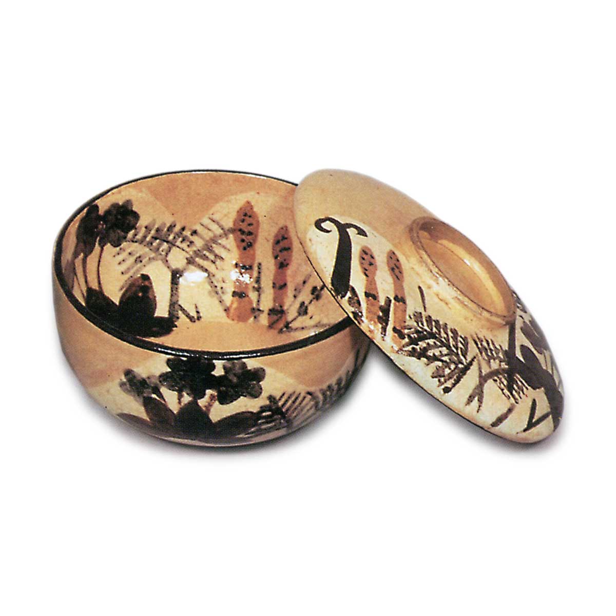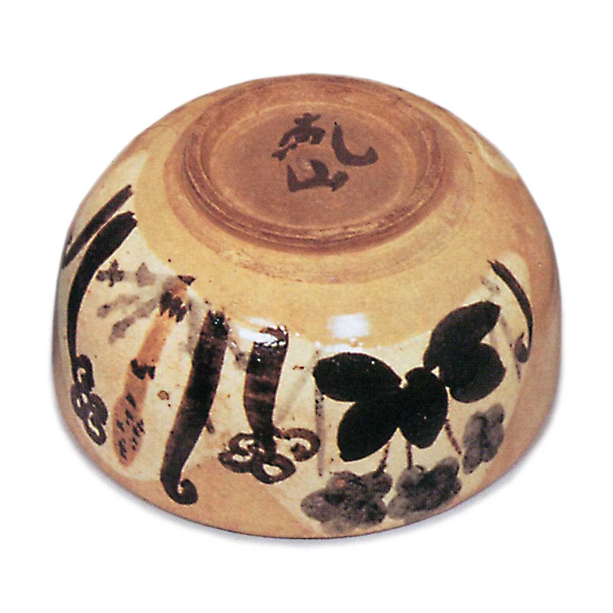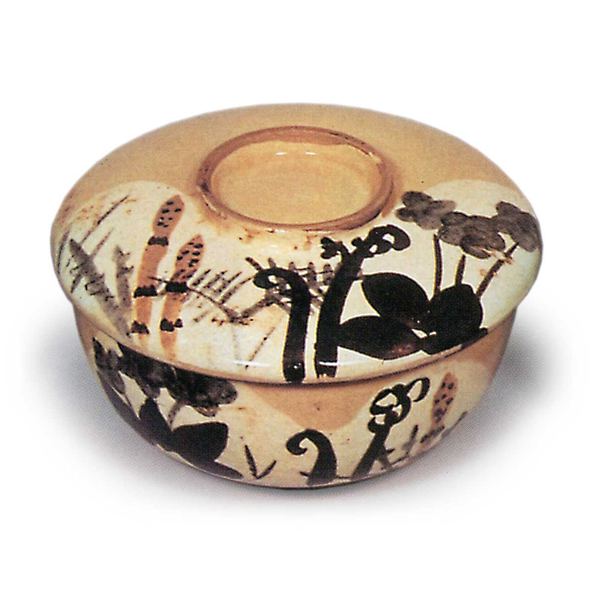 乾山锈绘染付春草纹盖碗 乾山乾山锈绘染付春草纹盖碗 2025.10.20 乾山锈绘染付春草纹盖碗 乾山锈绘染付春草纹盖碗 高8.1厘米 口径11.5厘米 高台径5.2厘米汤木美术馆与「锈绘染付芦鹤纹盖碗」并称乾山盖碗杰作。此作以看似寻常的购入盖碗为胎体,于盖面、盖底及碗身内外施以如土坡般的白釉,其上悠然描绘毛茛、蕨类、堇菜等春草纹样,仅留高台边缘施透明釉。十只茶碗完美成套,每只高台内侧均题有“乾山”铭文。字体虽相近却不尽相同,尽显随性之笔。茶碗收纳于精美共箱,箱面盖面以粗笔题写“盖茶碗 画春草 十 乾山制”。
