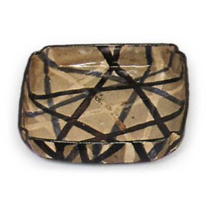 乾山鏽絵染付芒文四方入隅向付 乾山乾山鏽絵染付芒文四方入隅向付 2025.10.20 乾山鏽絵染付芒文四方入隅向付 乾山鏽絵染付芒文四方入隅向付 高3.5厘米 口径12.2×12.3厘米 底径6.4厘米碗身施薄白釉,以白彩、钴蓝及铁彩交错绘制芒草纹样,外覆透明釉。其内角四方造型似仿志野等风格的小碗。高台边缘露出素坯,台缘处长方形框内题写“乾山”铭。