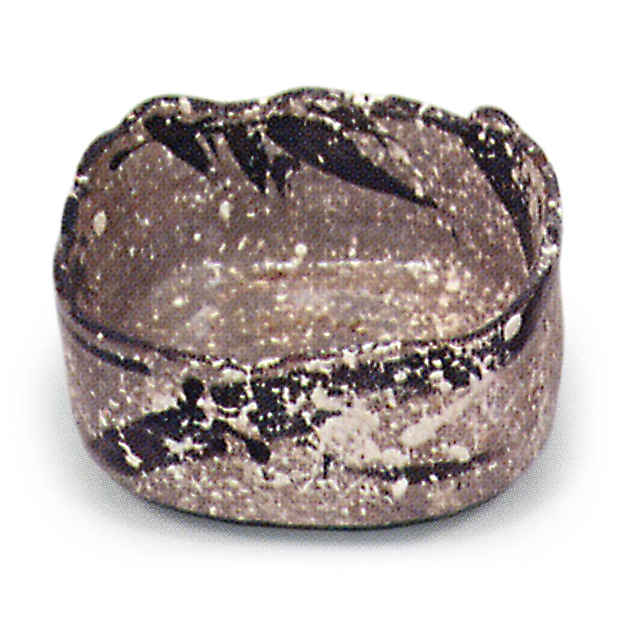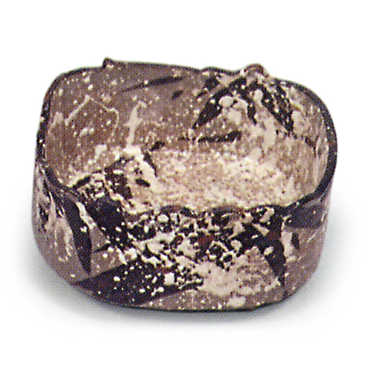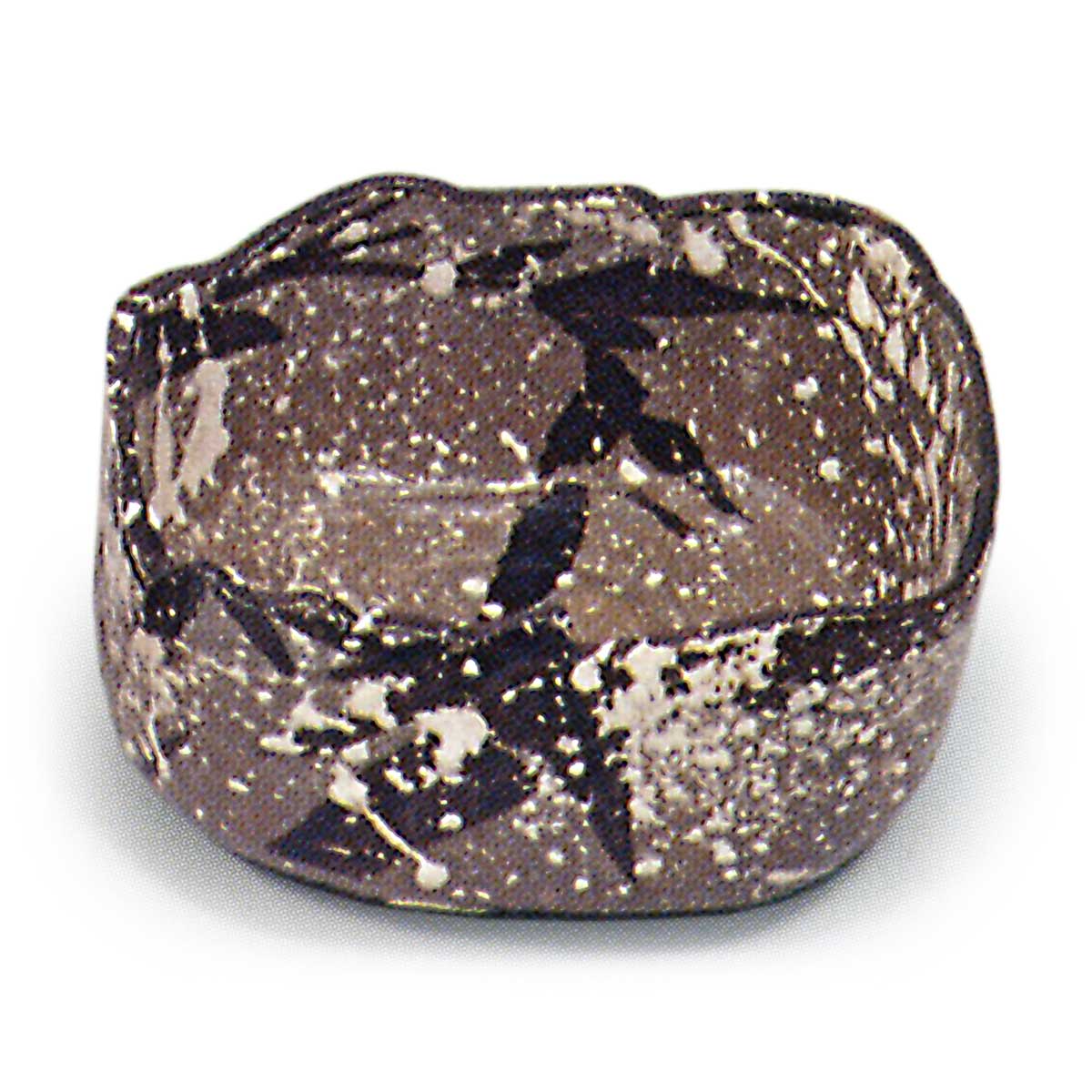 此为饰雪笹纹的方形小碗,碗底三足支撑,碗口边缘随纹样不规则地切削成形。以锈彩绘制竹叶后,再撒白泥表现雪景,尤为精妙的是从外侧碗身下缘至碗口内外环绕一株竹子的设计。底款题写“乾山”三字,其字体与“锈彩雪笹纹手鉢”所用字体相同。