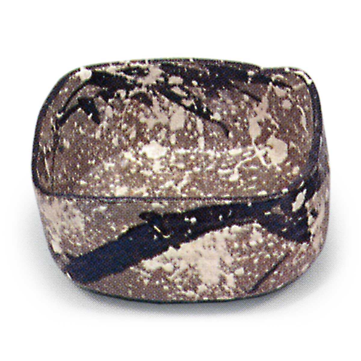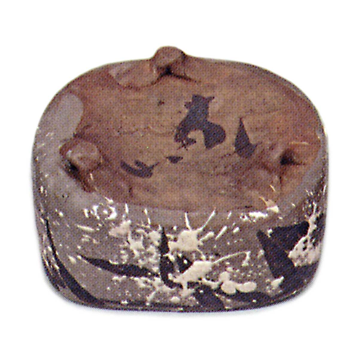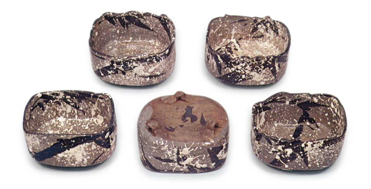 此为饰雪笹纹的方形小碗,碗底三足支撑,碗口边缘随纹样不规则地切削成形。以锈彩绘制竹叶后,再撒白泥表现雪景,尤为精妙的是从外侧碗身下缘至碗口内外环绕一株竹子的设计。底款题写“乾山”三字,其字体与“锈彩雪笹纹手鉢”所用字体相同。