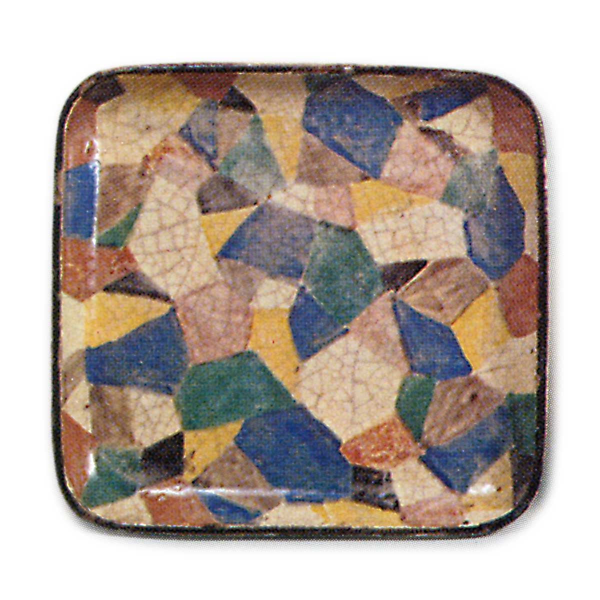 乾山色绘切纸纹小碗 乾山乾山色绘切纸纹小碗 2025.10.20 乾山色绘切纸纹小碗 乾山色绘切纸纹小碗 高2.5厘米 口径14.4×15.5厘米 底径10.2厘米抚平四方的平底小碗,底部凿出圆形高台。碗身饰以红、黄、白、绿、青等色纸片散落般的纹样,外缘则以青色上彩奔放描绘花唐草纹,此种前所未见的创新纹样,宛若色样本般别具风韵。高台内刻有“日本元禄年製乾山陶隠”字样,并以书印形式呈现“尚古”印章。具体制作于元禄年间的何时已不可考。