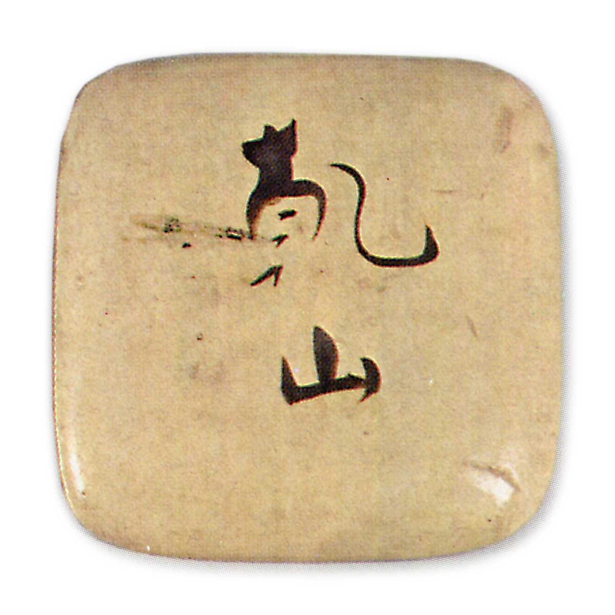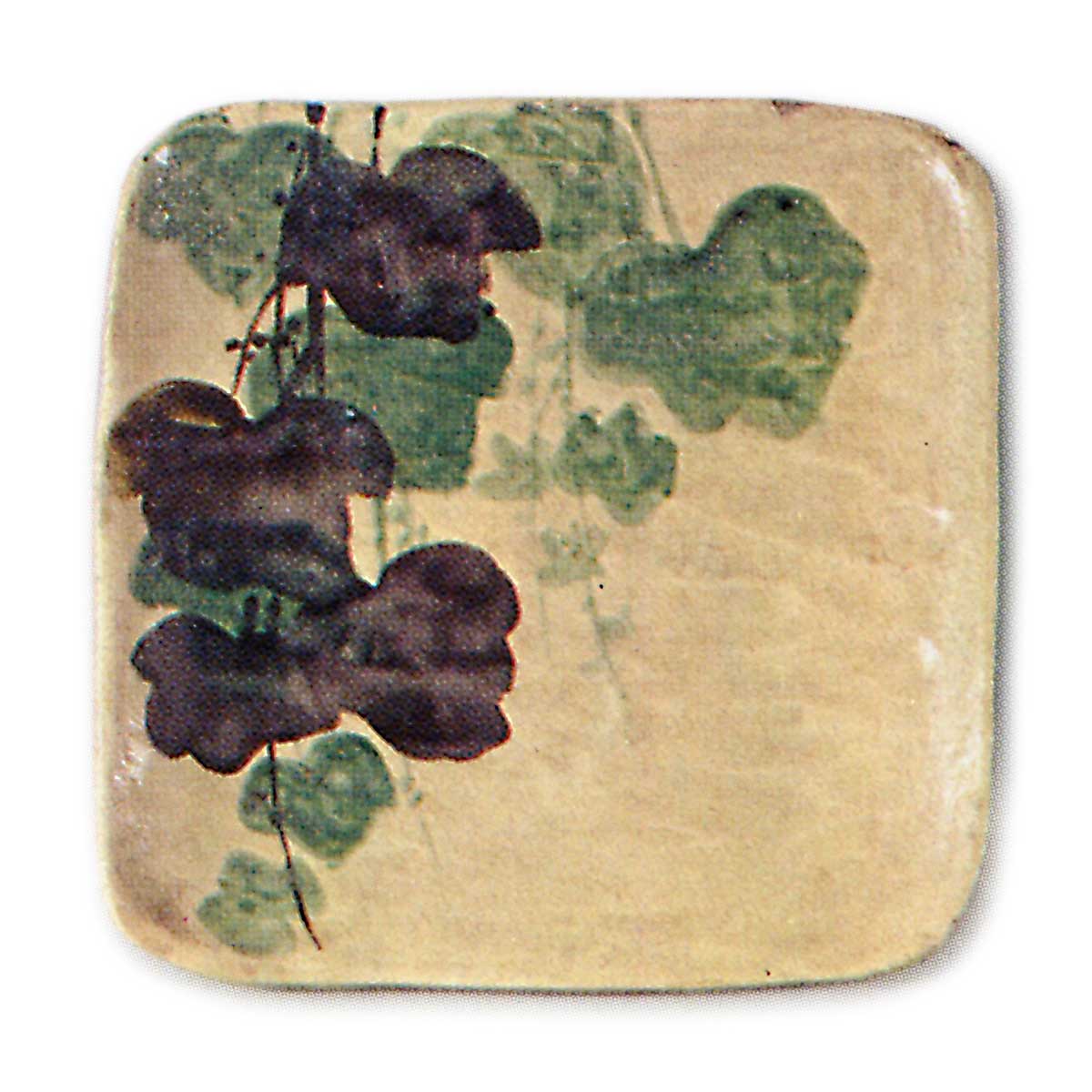 乾山色绘蔦纹角皿 乾山乾山色绘蔦纹角皿 2025.10.20 乾山色绘蔦纹角皿 乾山色绘蔦纹角皿 高1.8厘米 口径19.0×19.0厘米 圆底此为抚四方平底盘,盘面留有似手斧凿刻的痕迹,故俗称刨痕盘。通常以五客、十客为一套配色组合,除抚四方外亦有长方形款式。此件堪称绘纹之最,白釉底施透明釉烧制,盘面饰藤蔓纹样,另有野菊、萩草、玉菊、藤蔓等纹饰。底款“乾山”字迹与光琳、乾山合作款相近。原装匣内题有“乾山 乱绘角皿”