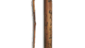 略扁的粗筒,为保留纹理特意保留部分树皮进行整体削制。以倒角面为正面,底部题有“雪似白云(花押)”,以舒展笔触散写下述歌谣:“山巅积雪更显山脚风情,层云叠叠映山峦”