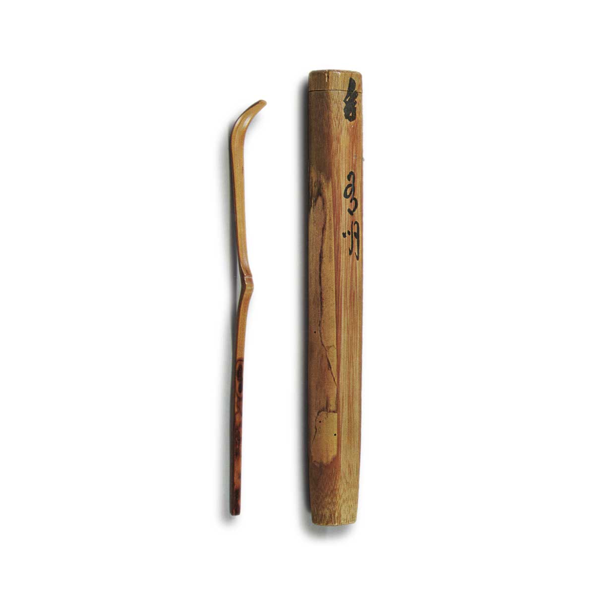 与茶杓同竹,黑白斑纹绚烂交错,经武士风格的利落切面处理,下端渐收呈收口造型。与远州的“曲舞”、将监的“将字”并称大名茶杓三杰。筒身“有明”题字精妙绝伦,口印花押亦属罕见,未见其他同类作品。