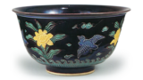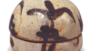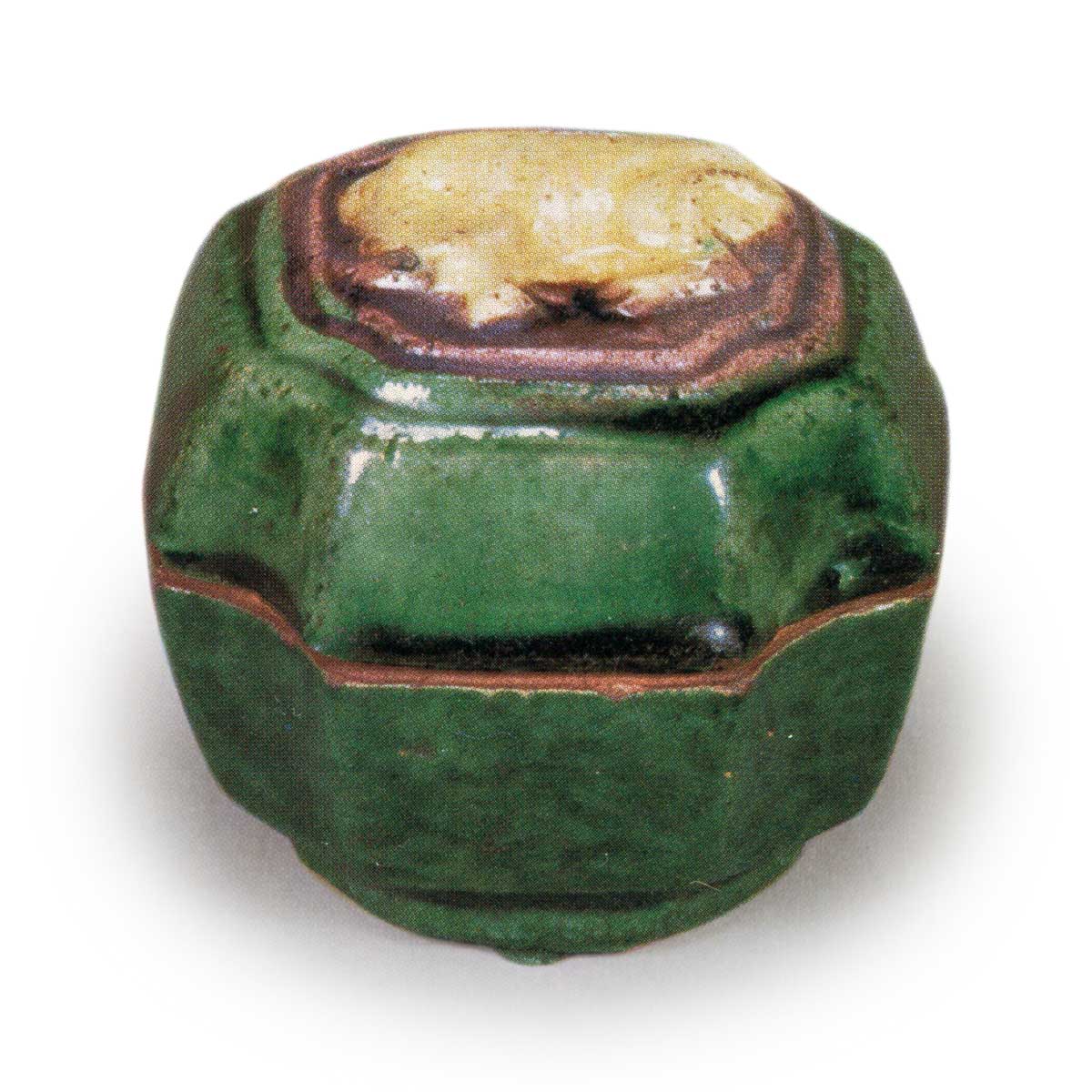 此香合在造型香合中位列东方次席。虽存世稀少,却以绝品之誉广受推崇。器形端庄,釉色尤为精美,以交趾香合特有的黄釉为底,牛形图案跃然浮现。周身紫釉与整体青釉的协调相得益彰。