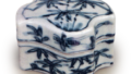 盖面多饰中国人物纹样,然此香盒罕见地绘有髯寿老人,故被视为珍品。这或许是中国窑场工匠的即兴创作。器身侧面同样饰有渔樵问答图,白釉与蓝釉皆烧制得清透雅致。