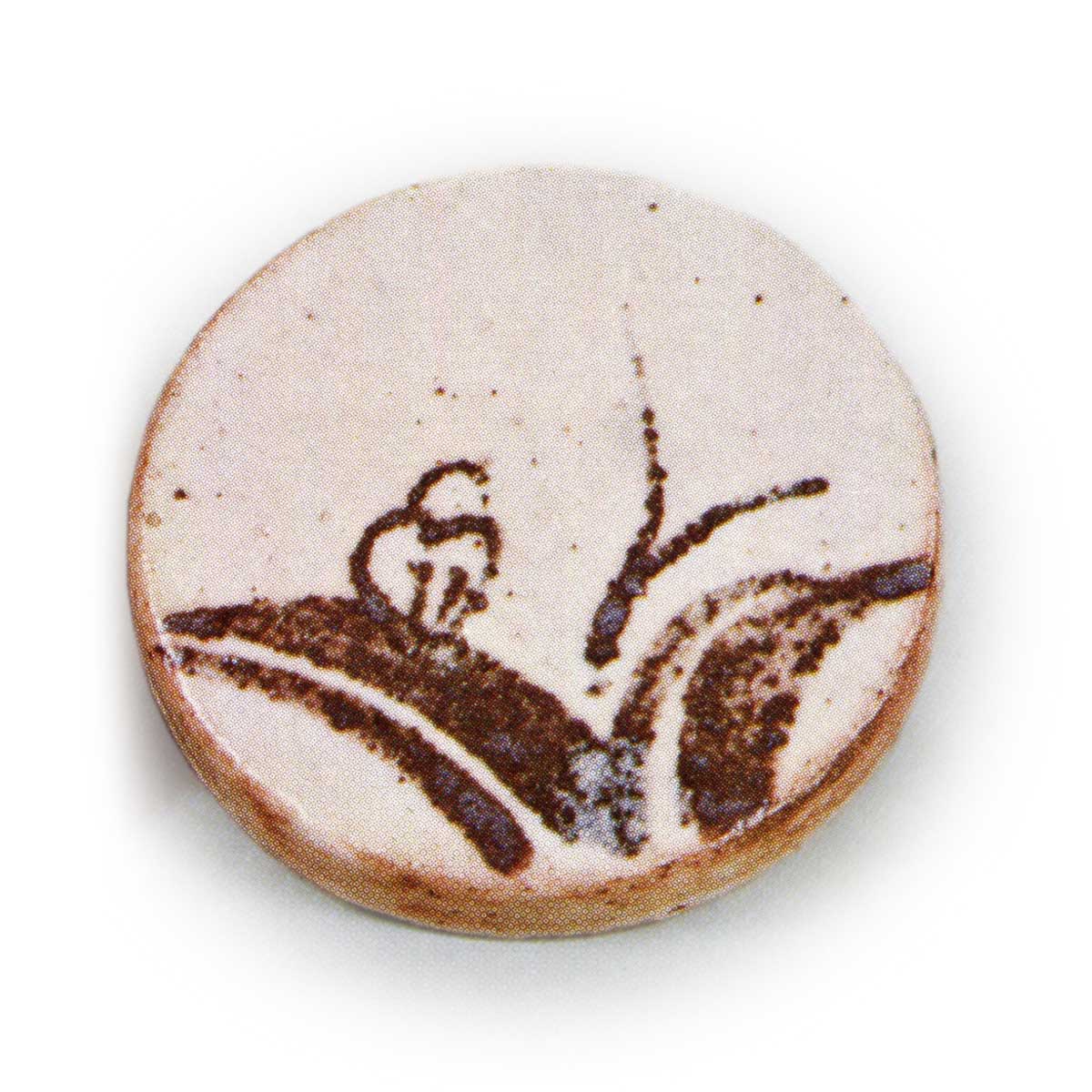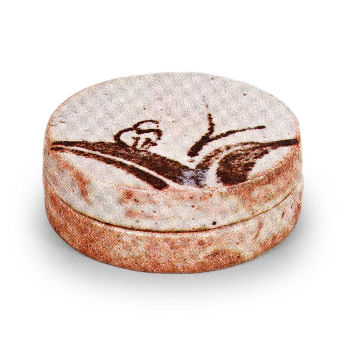 所谓一文字万年青香合,其形制为圆形,因横向一笔划的造型而得名。盖面以铁釉绘制一株万年青,笔势遒劲如水墨画,在圆相中构成一幅画面,布局精妙。