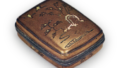 上代蒔絵 飞鹤纹螺钿入长角 日本上代蒔絵 飞鹤纹螺钿入长角 2026.01.09 上代蒔絵 飞鹤纹螺钿入长角 尺寸高约3.3厘米口径6.7—8.7厘米重约60克 此香盒与前文所述“鹤纹螺钿香盒”同属贵妇梳妆器具,原藏于手箱之中。其年代可追溯至莳绘香盒的最早时期。此香盒呈长角形,锡边镶饰,梨地之上以螺钿与莳绘交织松鸥啄鹤纹样。盖内与盒身内壁以梨地为底,点缀着小松树的莳绘纹样。表面显露经年使用痕迹,韵味深厚,与前述香盒并称双璧,堪称此类香盒中最古老的典范。