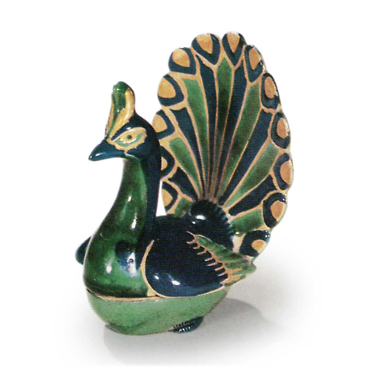 彩绘孔雀香盒 京都烧彩绘孔雀香盒 2026.03.06 彩绘孔雀香盒 高7.9厘米 长径5.0厘米东京国立博物馆此香盒以淡褐色釉地为基底,釉面开片,其上以绿、蓝、金彩上釉绘饰,实为古清水小品中罕见的杰作。几乎不留余白的青绿彩绘风格与所谓交趾烧颇有共通之处,展开尾羽的孔雀造型中,可见御室仁清将鸟兽与贵族仪轨主题巧妙转化为香炉香盒纹样的影响。此类古清水彩绘香盒惯用青、绿、金三色上彩,不施赤色。青绿釉彩厚重施釉,烧成后呈现透明感十足的深邃鲜艳色调。盒口与平底处露胎,底面无任何标记。