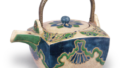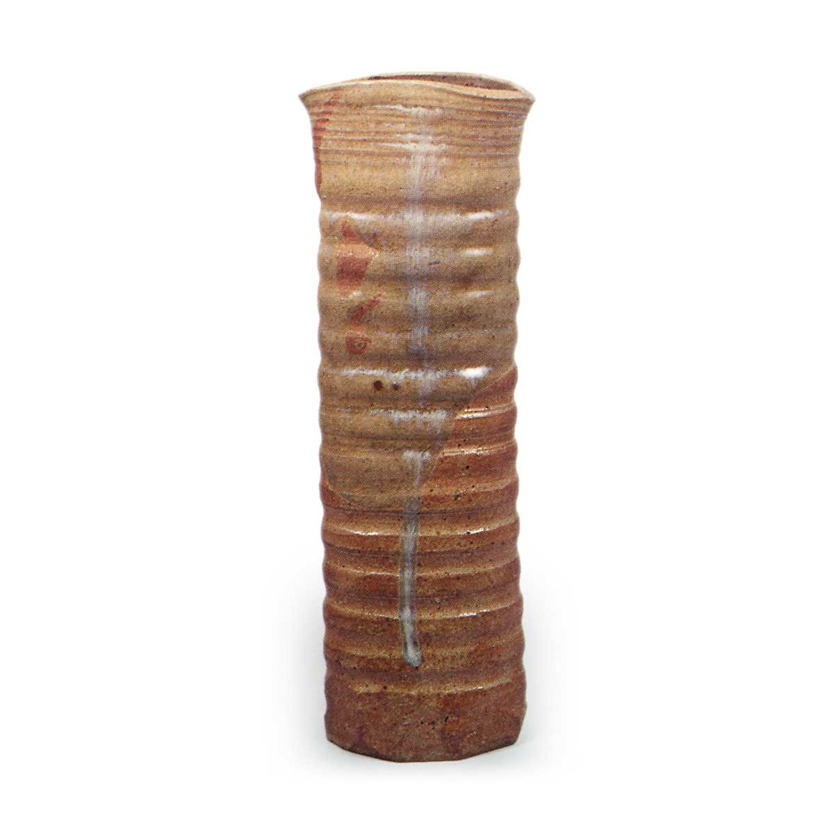 流釉筒花入 京都烧流釉筒花入 2026.03.06 流釉筒花入 高26.9厘米 口径3.8×9.7厘米 底径4.6×7.6厘米滴翠美术馆内盒盖面题写“栗田烧 挂花入 信乐手”,背面贴纸以古笔了仲之笔断定为金森宗和真迹。自江户初期以来,此作被传为京都最负盛名的粟田口烧作品,颇为耐人寻味,其制作手法亦呈现江户前期风格。此扁平悬挂花器在器身设置阶梯状台阶,以信乐风格的土质烧制,自口沿至器身中部覆盖灰釉,并呈现卯斑状釉流痕迹。整体造型浑圆厚实,无疑是为契合茶人审美而作。背面留有烧制时的烙印。