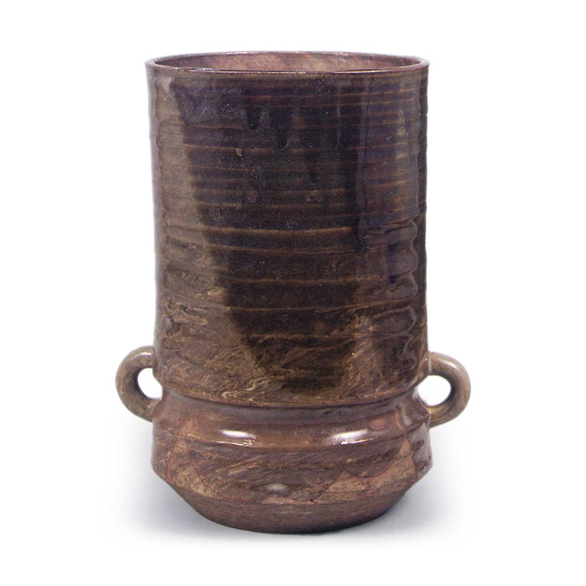继后水尾院创立修学院烧之后,后西院又兴起野神烧,此件作品即为野神烧之作。此筒形水指仿仁清风格,器身下部收束深隽,两侧饰以圆耳。器身下半部采用白土与赤土混合的素坯,单面施以琥珀色釉,另一面则施灰釉,形成单身替釉色,但釉色略显黯淡。器底边缘经倒角处理,高台呈棋笥底样式,浅削处理。
