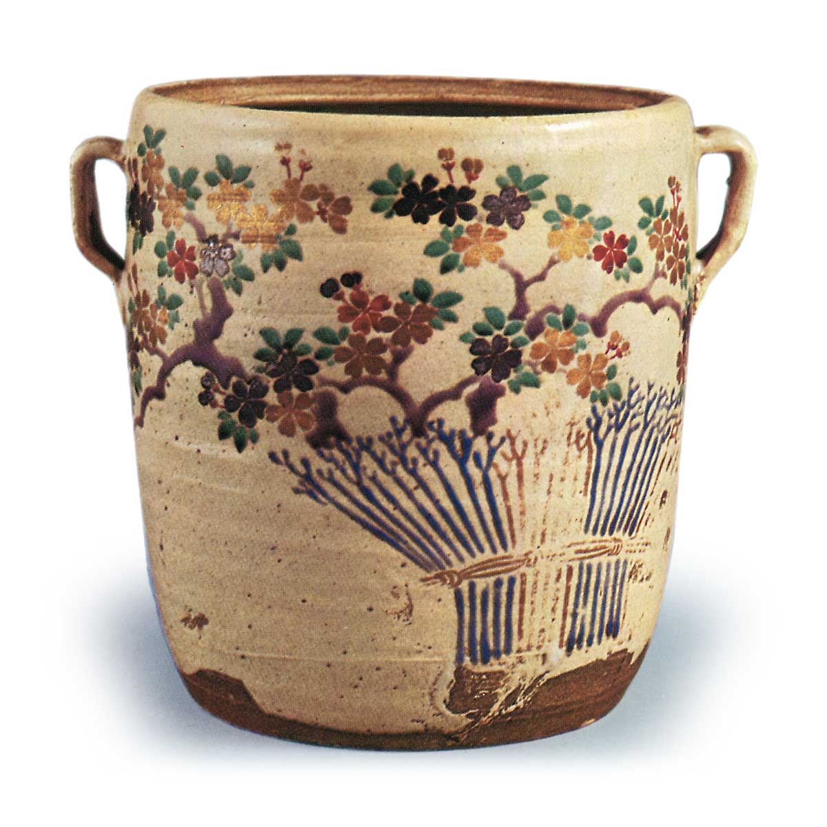 虽无法确知出自何窑,仍堪称江户中期以前京都烧的代表作例。器形仿仁清风格,胴部上下左右各饰耳耳,厚施泛黄白釉,胴身绘樱花与柴垣纹样,其意趣近似元禄、享保时期的锅岛烧。器底至底缘处显露素坯,土胎呈焦红色。