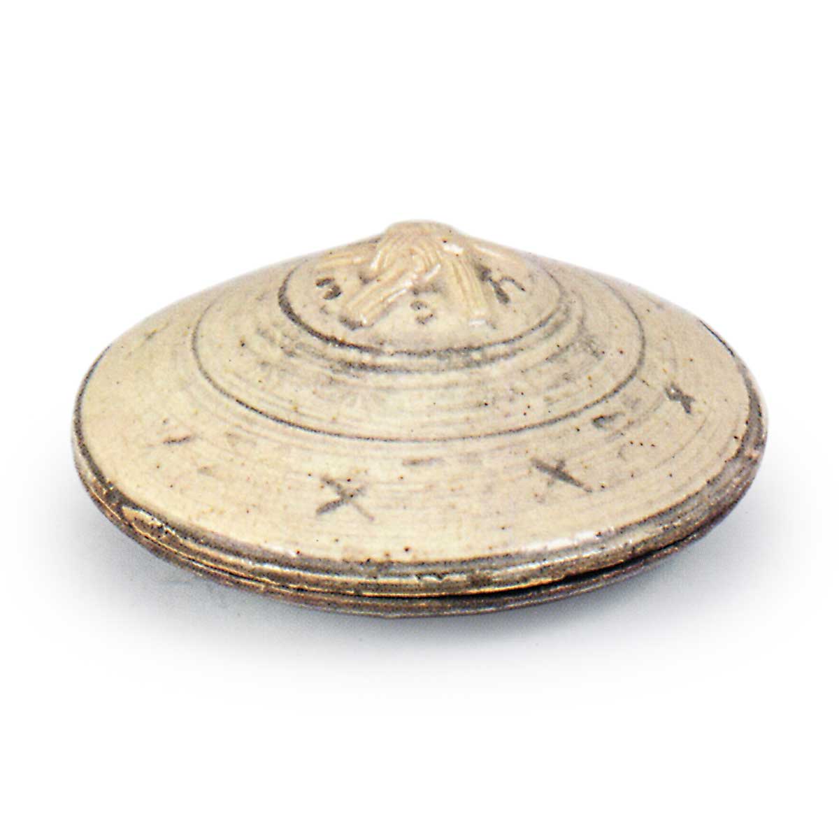 三岛写笠香合 京都烧三岛写笠香合 2026.03.08 三岛写笠香合 高3.6厘米 口径6.2厘米 底径4.0厘米滴翠美术馆此为笠形平底香合,以白泥刷涂表面并施以线刻纹饰,尽显三岛风韵。平底左侧捺有椭圆形小印“清闲寺”,内盒盖面题有“笠 高丽”字样。本品为松浦家传世之物。