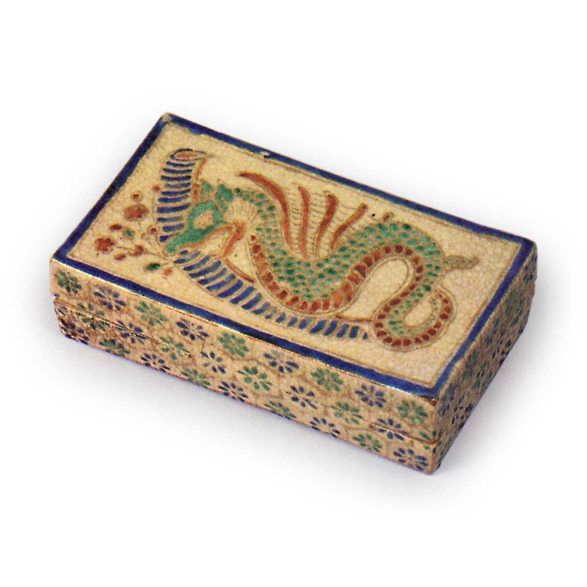 江户时代前期涌现了大量以云纹歌留多为设计元素的工艺品。此香盒即为其中之一,长方形香盒盖面以青色上绘清晰勾勒边框,框内绘有红绿相间的龙纹,侧面环绕龟甲纹地纹。地釉釉面虽生有开片,但烧制质地柔润,底面呈现素土质感。内盒盖面题有“清闲寺烧香合”字样,应属清闲寺烧早期作品。