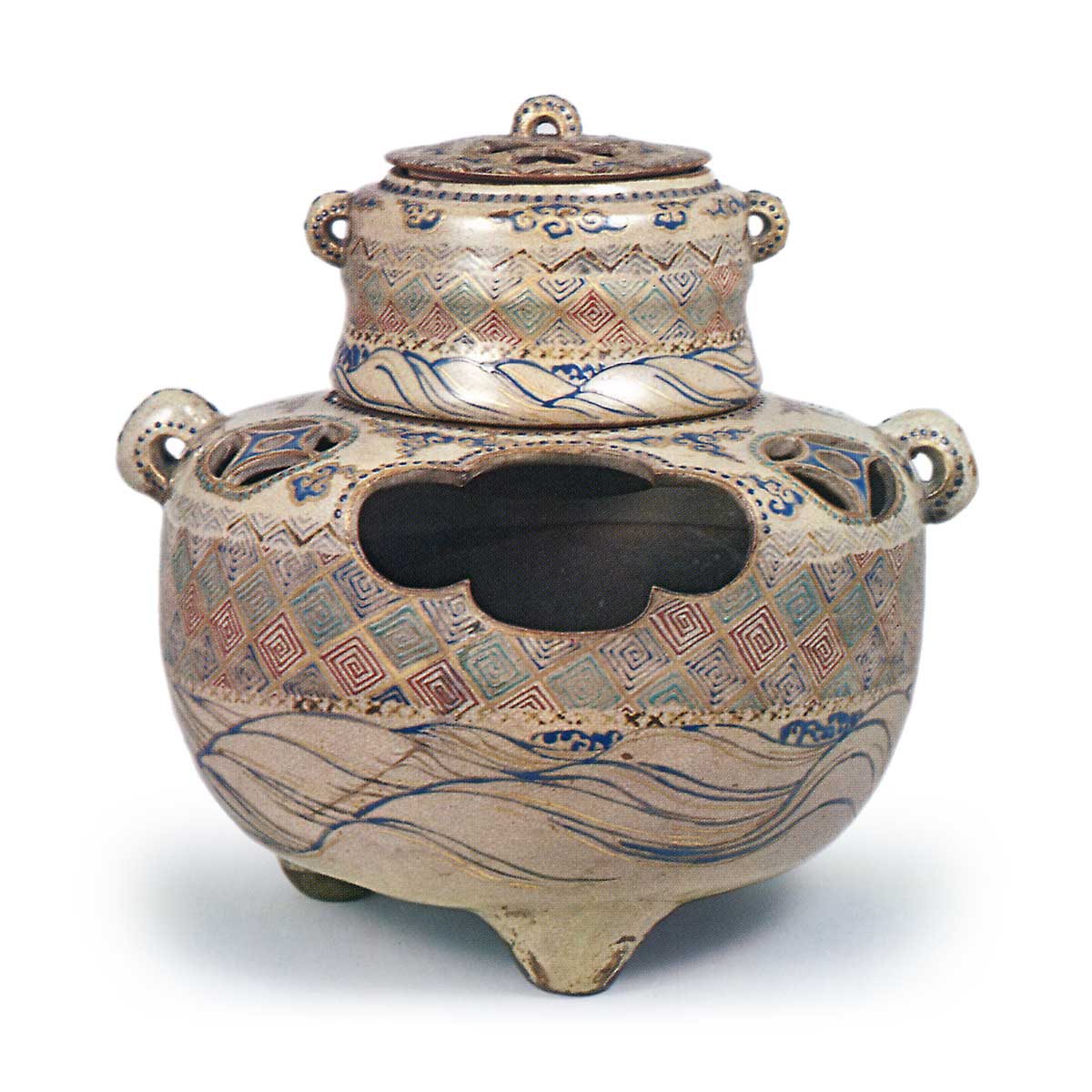 色绘流水纹风炉釜 京都烧色绘流水纹风炉釜 2026.03.08 色绘流水纹风炉釜 高21.4厘米 宽22.0厘米 三足此乃煎煮丁香的丁香风炉。古时厠所等处有煎煮丁香皮以散发芳香、消除异味的习俗,京都上流社会中应曾使用过如此华美的丁香风炉。京烧丁香风炉现存数量颇多,此件堪称其中最杰出的典范。整体采用薄胎工艺,以彩绘呈现波涛纹与雷纹,壶盖及风炉则饰有透雕木瓜纹与七宝纹等图案。