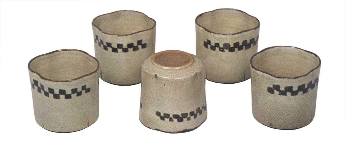 木瓜形猪口,五客成套。口沿施黑釉,器身以锈釉绘制石板纹样,除高台外全面施通体开片釉,釉面隐现淡红色泽。高台内侧左方捺有“岩仓”印章。
