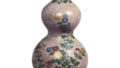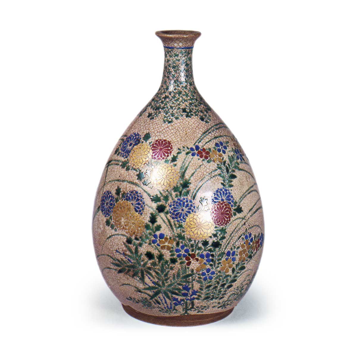色绘秋草纹酒壶 京都烧色绘秋草纹酒壶 2026.03.09 色绘秋草纹酒壶 高24.1厘米 口径3.8厘米 胴径14.8厘米 底径9.5厘米此酒壶虽属备前烧等器型中常见的辣形,但其口部至胴裾处仍厚施着呈现朽叶色调、带有粗粝开片纹的釉料,其上以彩绘与金彩描绘以菊花为主体的秋草纹样。作风与前图作品近似,但裸露陶土的高台内侧捺有“岩仓”印记。岩仓烧与音羽烧的关联虽未明朗,但两者作风完全一致的现象颇为耐人寻味。