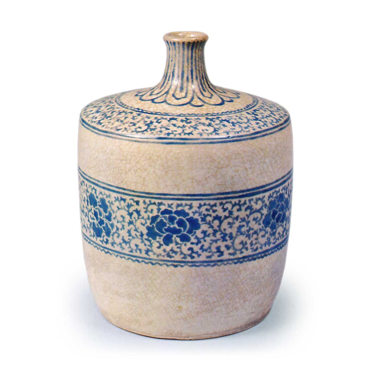 色绘牡丹唐草纹酒壶 京都烧色绘牡丹唐草纹酒壶 2026.03.10 色绘牡丹唐草纹酒壶 高16.1厘米 口径2.4厘米 底径9.9厘米此为肩部外凸的筒形酒壶,配有细颈。除底面外,通体施白釉并见开片纹,颈部、肩部及瓶身饰以青色上彩绘制的牡丹唐草纹与章鱼唐草纹。另存有仁清所作设计相似的酒壶。