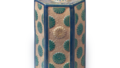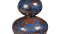 锈地色绘梅花纹瓢形酒壶 京都烧锈地色绘梅花纹瓢形酒壶 2026.03.10 锈地色绘梅花纹瓢形酒壶 高17.8厘米 口径1.7厘米 胴径13.1厘米 底径6.9厘米器身紧实饱满,呈瓢形酒壶之姿。自口沿至壶底,铁釉层层浸润,釉面如熔融般光滑。其上以青色与淡紫色描绘梅树与花朵纹样,局部施以金彩装饰。因底釉色泽浓郁,上彩颜料涂抹得较为厚重。据器形判断,应为江户中期之后的制品。