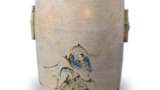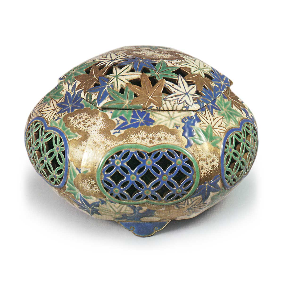 色绘红叶七宝透纹手焙 京都烧色绘红叶七宝透纹手焙 2026.03.10 色绘红叶七宝透纹手焙 高18.3厘米 胴径25.1厘米 三脚此亦属手焙,其内部设有六角形火袋。故口沿呈六角形,胴部略带膨胀,配以同样六角形的甲形盖。盖面以透雕技法刻出红叶纹样,器身六面均饰七宝透雕窗格,底纹为连续红叶纹,局部点缀源氏云纹。虽无法确知此类优雅作品出自何窑,但堪称古清水烧的典型代表作。