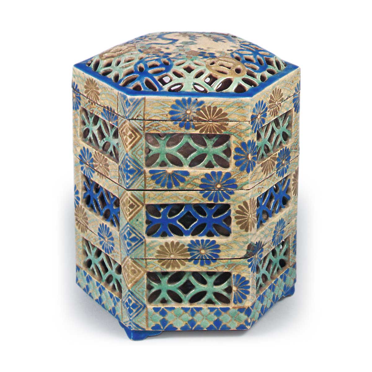 彩绘菊七宝透纹重箱 京都烧彩绘菊七宝透纹重箱 2026.03.10 彩绘菊七宝透纹重箱 高16.6厘米 口径12.4×12.5厘米 三脚此为三层六角形重箱,配有盖子。盖面及箱体侧面饰以典型的七宝透文样,底纹绘有花卉与菊花纹样,盖顶呈现梅竹图案。箱底平坦,三面附有三脚支架,内壁涂有金泥。