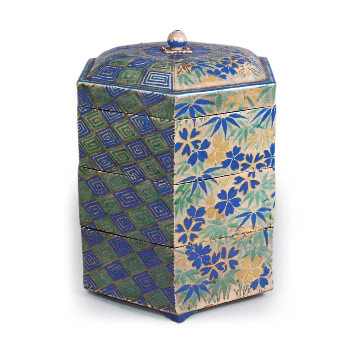 色绘樱花纹六角重箱 京都烧色绘樱花纹六角重箱 2026.03.10 色绘樱花纹六角重箱 高21.2厘米 口径13.9×13.9厘米 三脚此为六角三层重箱,饰有象征花蕾的镞形纽扣,箱盖顶部呈隆起拱形。盖沿饰以菊花花瓣纹样,自盖顶延伸至侧面绘有雷纹,三面则分三层描绘竹与樱花纹样。底部三面设有支脚,从内盖底至各层箱身饰有大小菊花交织的唐草纹样。尤为罕见的是,上层箱身底面以青彩勾勒出纱绫纹样线描。