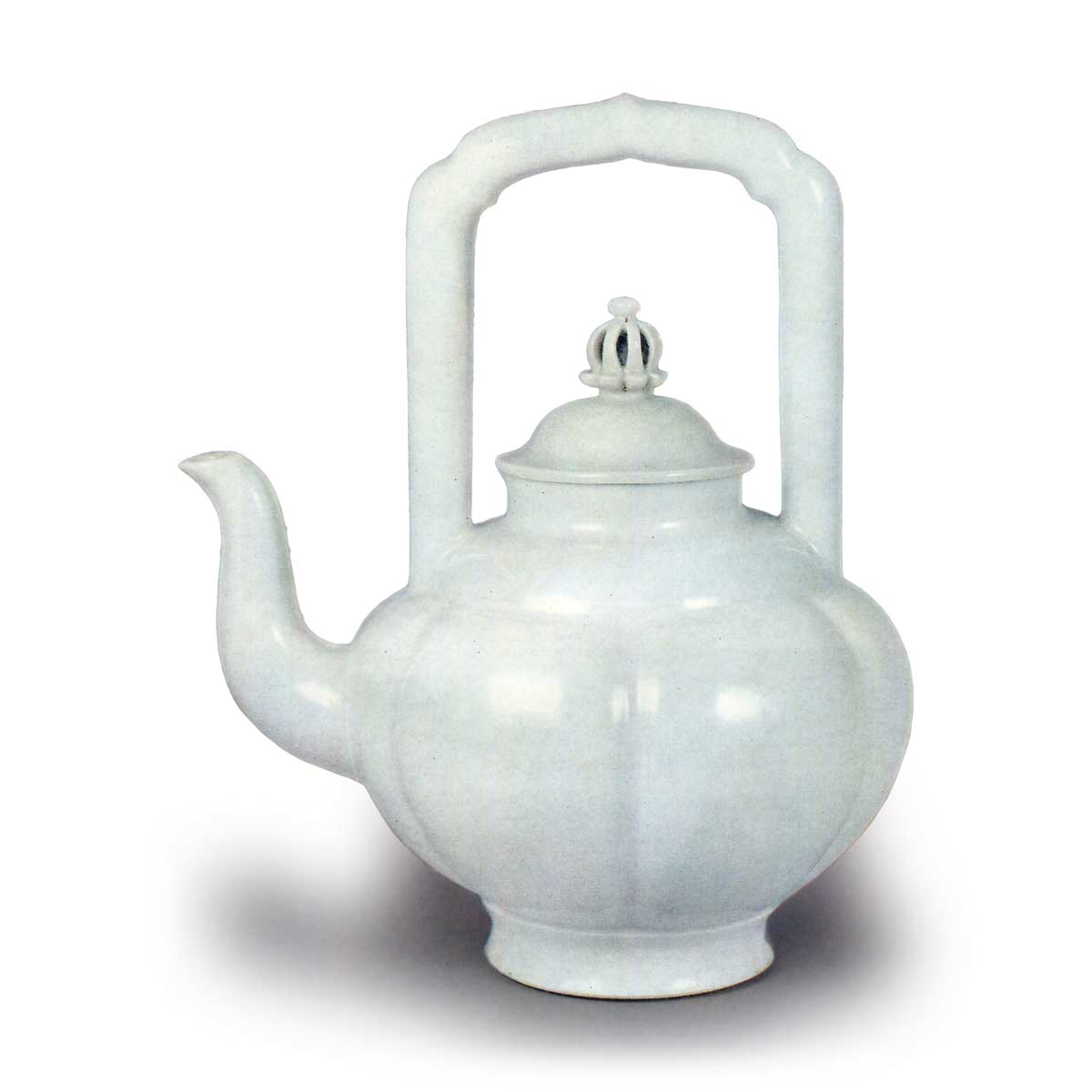 白瓷瓜形水注 京都烧白瓷瓜形水注 2026.03.13 白瓷瓜形水注 高19.8厘米 宽16.1厘米 底径6.3厘米京都府立综合资料馆共箱盖面题有“白瓷六瓣哲梁云屯 聾米造”。器身六面刻有纵向棱线形成瓜形,配以高大粗壮的梁状把手,拱形盖面饰有透雕绳纹。注口流畅自然,器形整体协调统一。器身以细线刻法施釉下龙涛纹,高台内中央捺有椭圆形“木米”印章,除台脚接合处外全面施白釉。与多为粗犷造型的仿交趾器物截然不同,此器规整美观,应是仿制自中国德化窑烧制的白瓷水注。