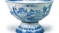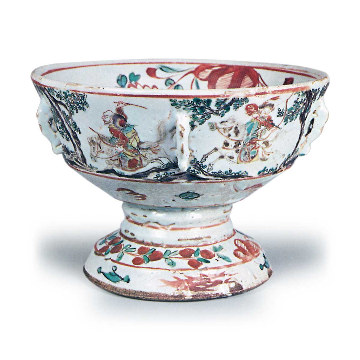 吴州赤绘仿铜台鉢 京都烧吴州赤绘仿铜台鉢 2026.03.14 吴州赤绘仿铜台鉢 高14.1厘米 口径20.5厘米 底径12.2厘米这是一款仿铜器造型的台鉢,器身五面各设耳,整体厚重。碗内中央的圆窗内绘有龙与草花,内侧两侧饰有菊花纹样;外侧五面描绘了斗马人,每面左右两侧均点缀有树木。吴州赤绘通常仅以红、绿两色进行上彩,但这件鹭川出土的作品却在骑马人物上增添了黄、蓝、紫三色,呈现出罕见的上彩效果。高台内侧被深切削,露出陶土原色。