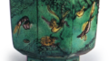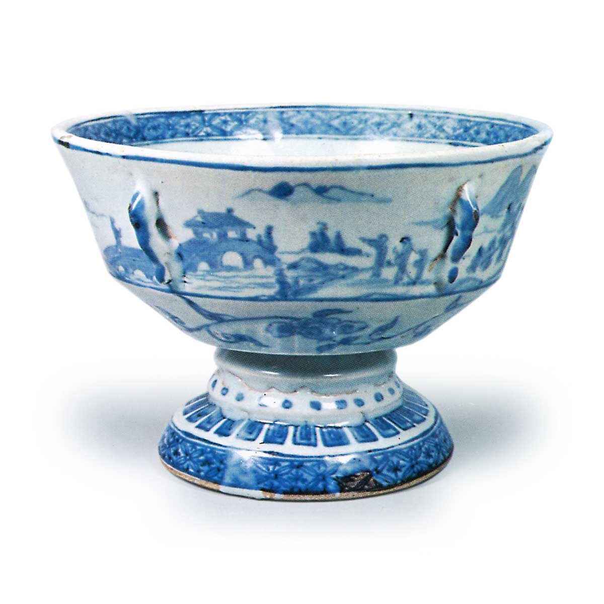 古染付写台鉢 日本古染付写台鉢 2026.03.14 古染付写台鉢 高14.5厘米 口径20.6厘米 底径12.4厘米东京国立博物馆器形与前图相同,但器身描绘了山水楼阁的风景画,内壁中央描绘了吹奏横笛的唐代美人,内侧四面绘有八宝纹。与其说是吴州染付,不如说是仿古染付风格的作品。横河民辅先生捐赠。