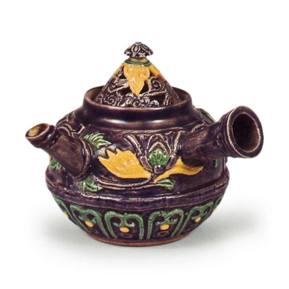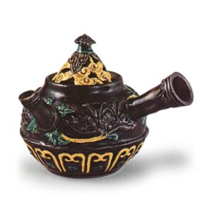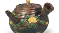 交趾仿唐草纹急须 京都烧交趾仿唐草纹急须 2026.03.14 交趾仿唐草纹急须 高10.8厘米 口径4.5厘米 底径4.4厘米这是木米紫交趾急须的代表作,两件器物似乎都是用同一模具制作的。不过釉色的搭配略有不同。壶身环绕着牡丹浮雕纹样,壶盖则透出云纹。把手下方有“木米”印记,盖底为素土,底部也盖有“木米”印记。原装盒上记载着“茶壶 为扇岭君作 木米 文政庚寅秋”,由此可知此作于文政十三年(1830年)。
