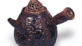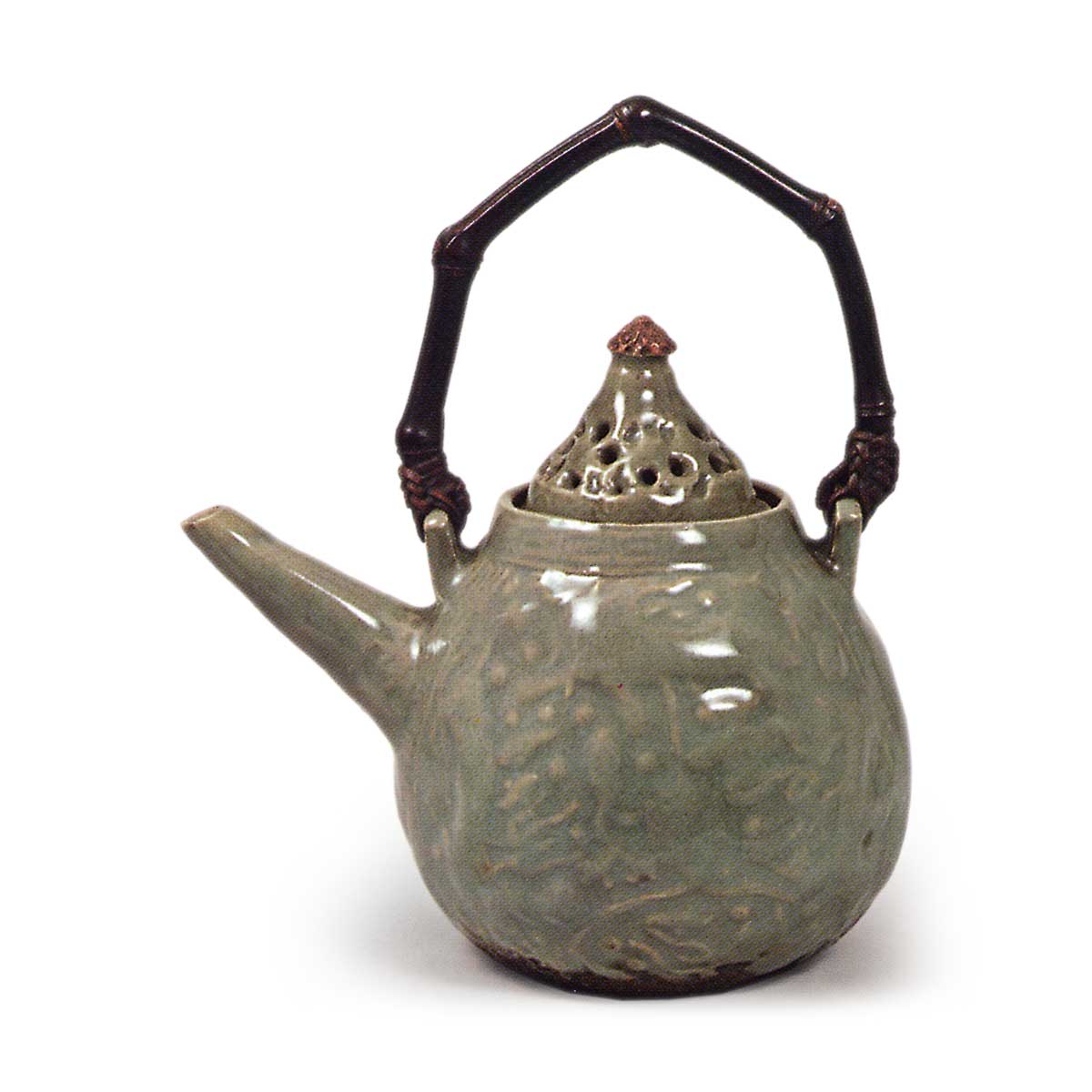 原装盒盖内侧题有:“傲傚越州藩瓶 博物要览以宜与砂土 为骨罩青釉 周世宗批日雨过天晴 云破处这盘颜色 作有成 聾米陶并识”。从盖子到壶身下缘均施有青釉,但如盒内题文所述,此器似乎并非仿越州青瓷之作。这显然是模制而成,器身虽饰有浮雕纹样,但纹样并不清晰。壶口稍长,未设把手。盖底盖有“木米”印记。