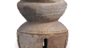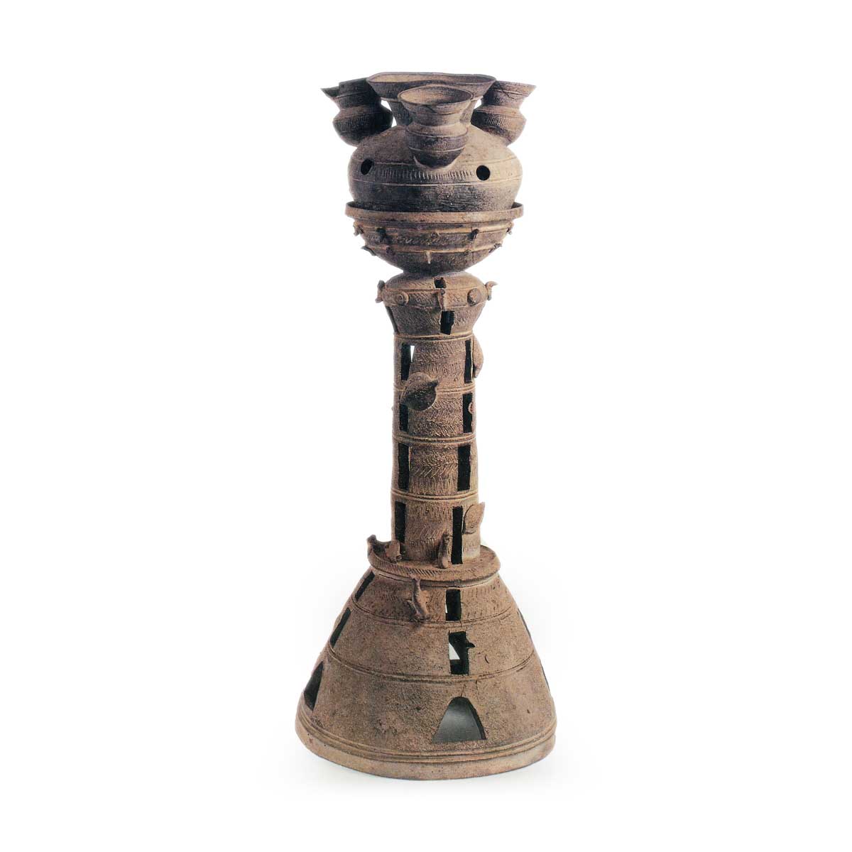 这是古式须惠烧的代表作之一,带有装饰着葫芦的圆柱形底座。这是一种大型礼器,与实用用途无关,器身中央有两个小孔,肩部有四个小把手。 这种大型容器通常与圆柱形容器底座搭配使用,这是一个典型的例子。容器主体上的小孔通常只有一个,但在这个例子中,它可能只是装饰性的。