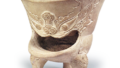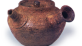 南蛮仿制急须 京都烧南蛮仿制急须 2026.03.15 南蛮仿制急须 高7.6厘米 口径5.2厘米 底径3.1厘米此件同样配有原装盒,盒盖正面题有“南蛮急须 百六山人木米造”字样。这是一款口部宽大、从腰部向下收窄的异形急须。肩部环绕两道线条,其下方饰有六个小雕纹。未加盖铭印,收纳于原装盒中。