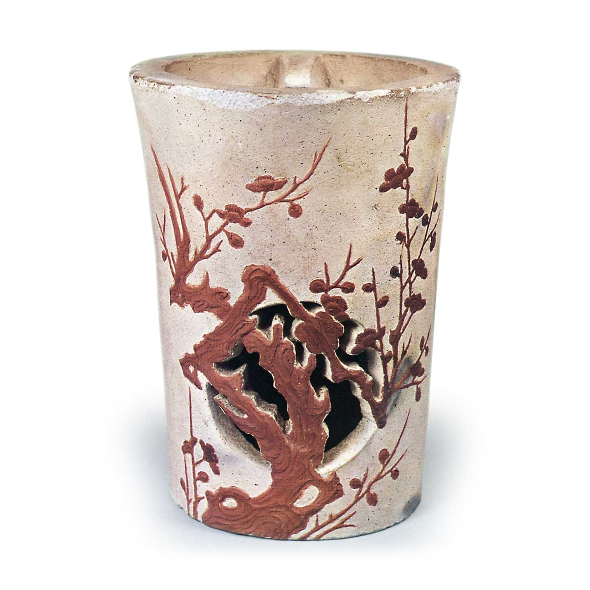 白梅树浮雕凉炉 京都烧白梅树浮雕凉炉 2026.03.15 白梅树浮雕凉炉 高20.5厘米 直径20.0厘米 底径11.9厘米这是一款厚实的筒形凉炉,正面浮雕有梅树纹样,其上涂有褐色颜料。中央下缘开有圆形风孔,该部分呈镂空状,营造出宛如满月间点缀着梅花的意境。梅花纹样笔触扎实且富有画意,平坦的底面印有方形印章。盒盖内侧有永乐和全于明治六年十一月题写的题跋:“楳月吕九々鳞木米自作也 应需和全识(花押)”。