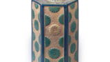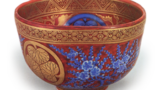 这是一款竹形盖架,器身饰有祥瑞圆纹,内侧以青花绘有“古器观造”字样。